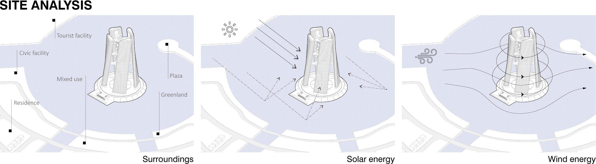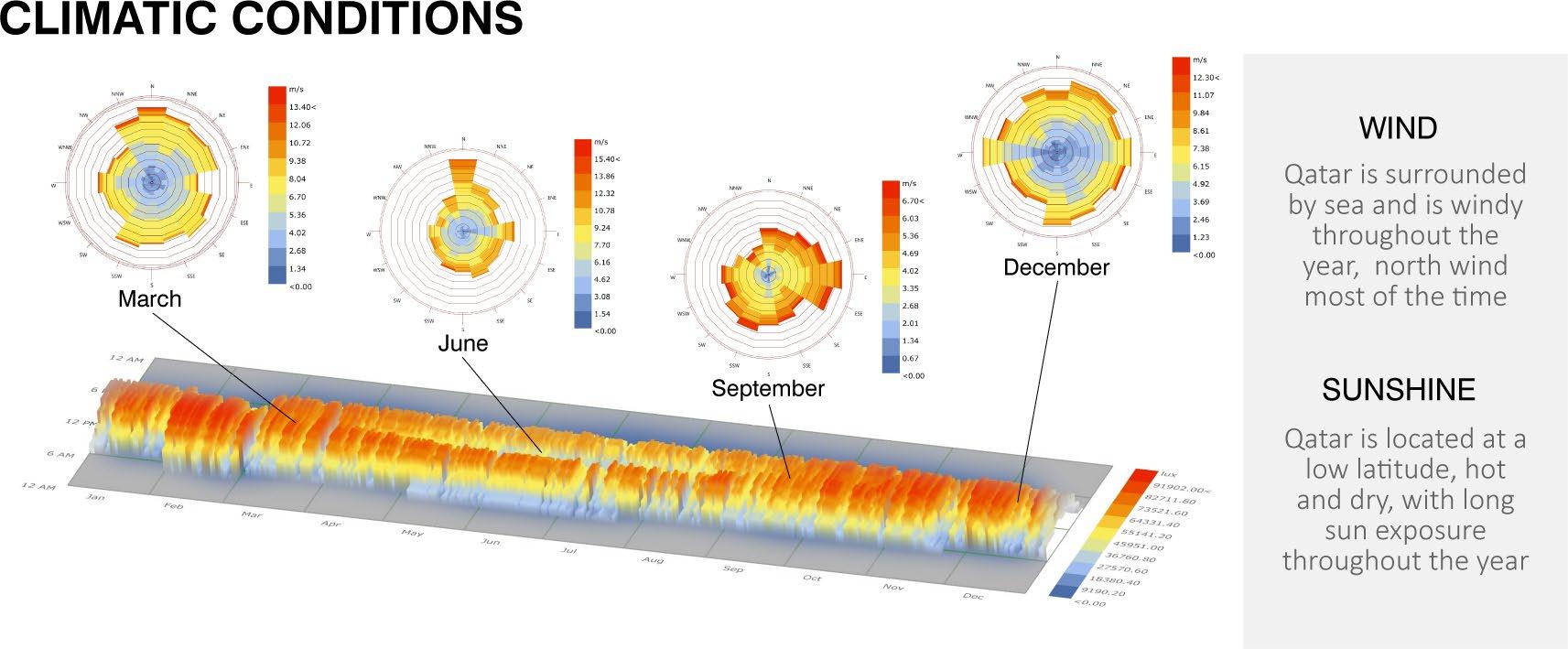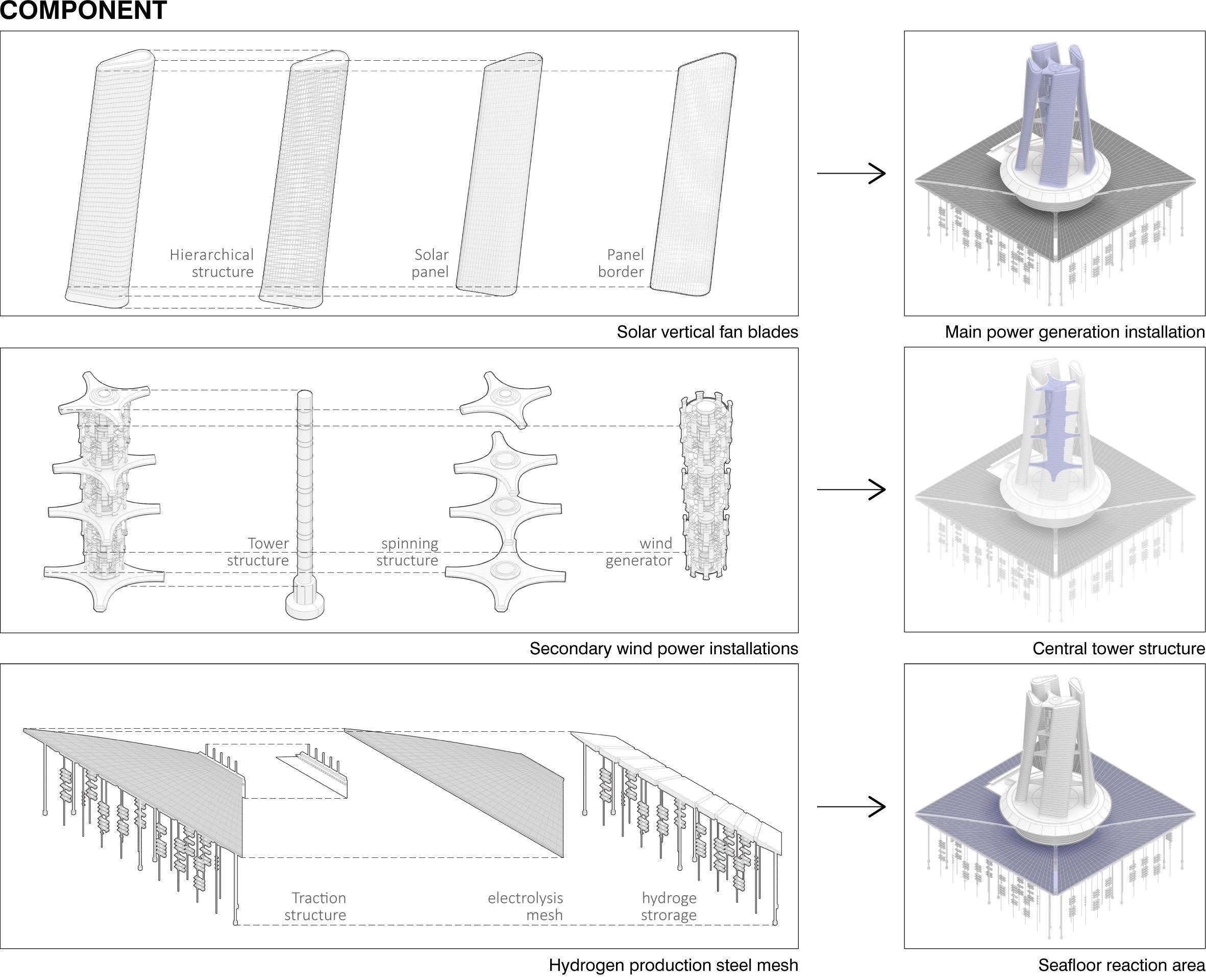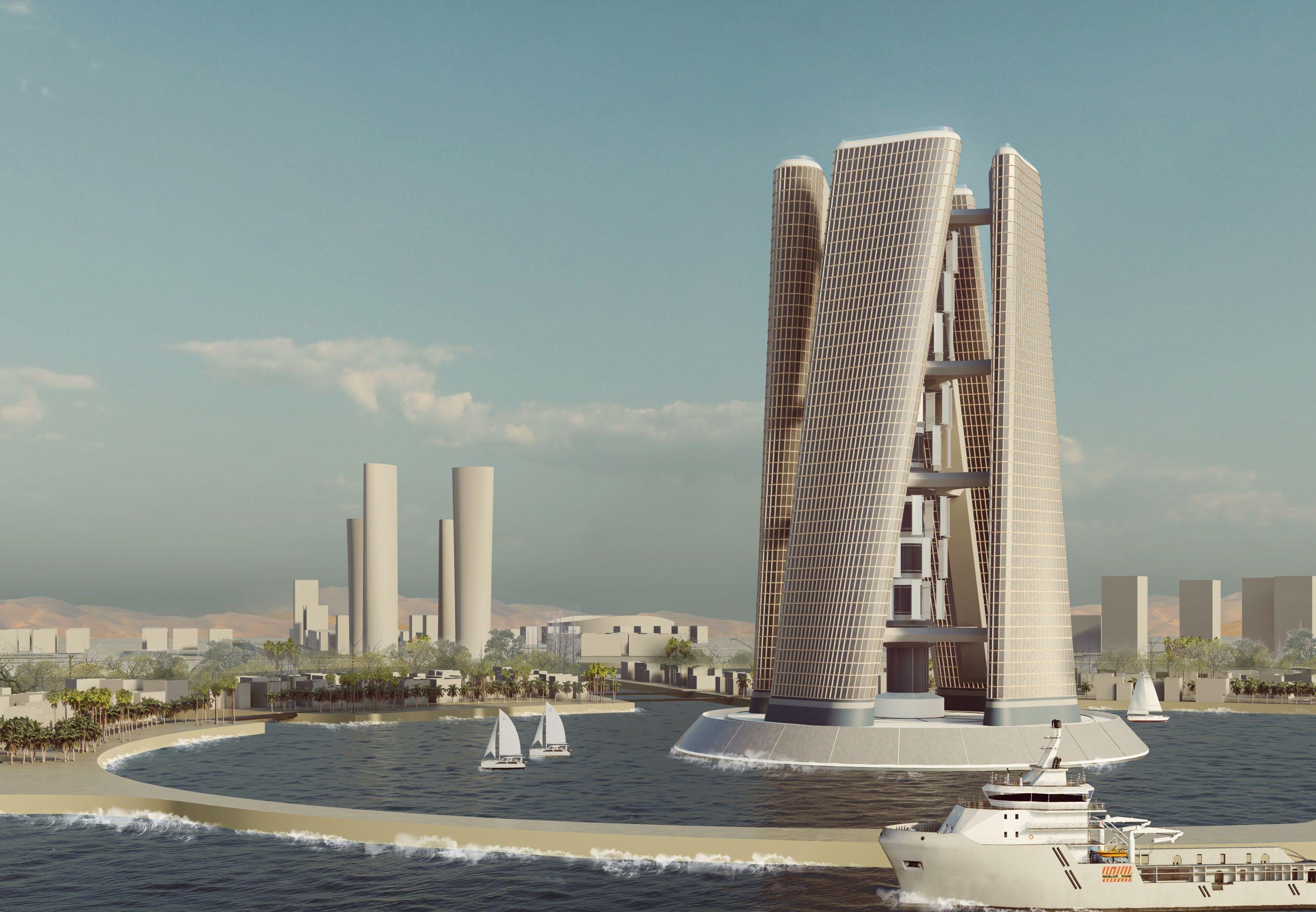 Inspired by Dubai's Squall Tower, decided to add 75% coverage solar panels to the giant vertical axis wind turbine, so that this hydrogen tower can maximize the conversion of the abundant wind and solar energy along the Qatari coast. Qatar's frequent winds and plenty of light provided some assurance for my design
