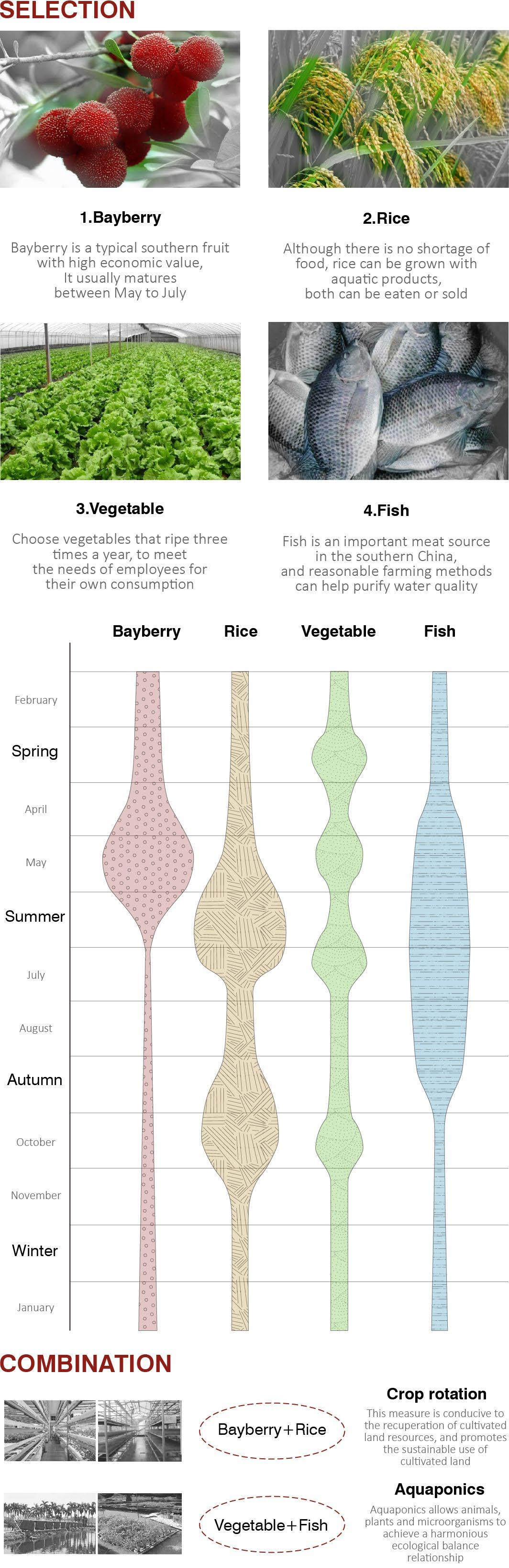 During the growth period of bayberry, in order to ensure the growth of rice, the model gives sufficient direct light to the rice, and places the bayberry on the east and west sides, which is suitable for the growth of bayberry and does not waste resources. The living unit is planted between bayberry and rice, as a link between 2 sides.
