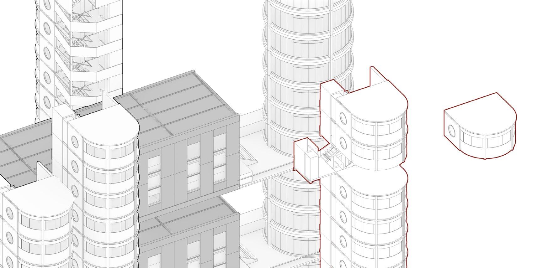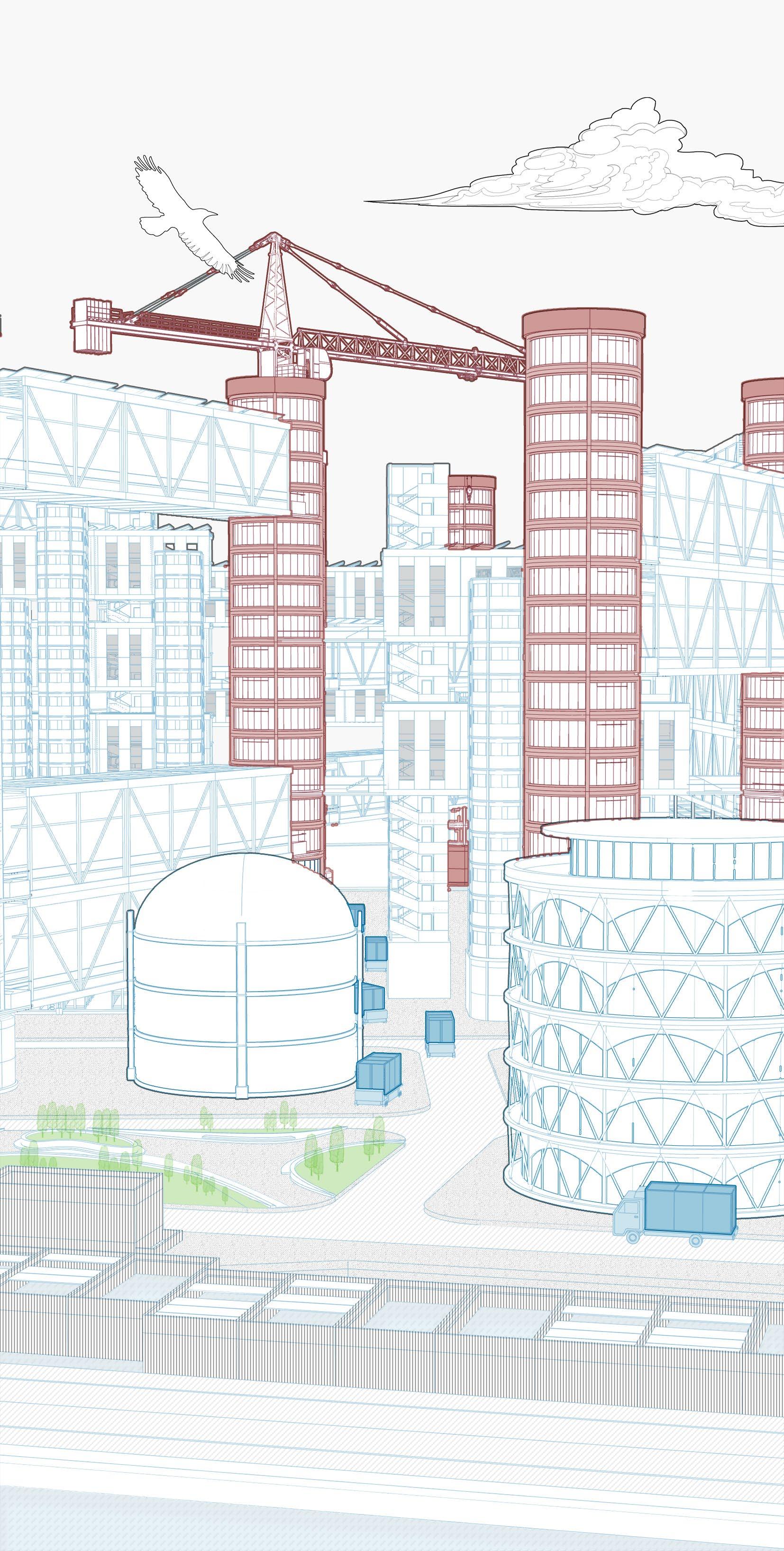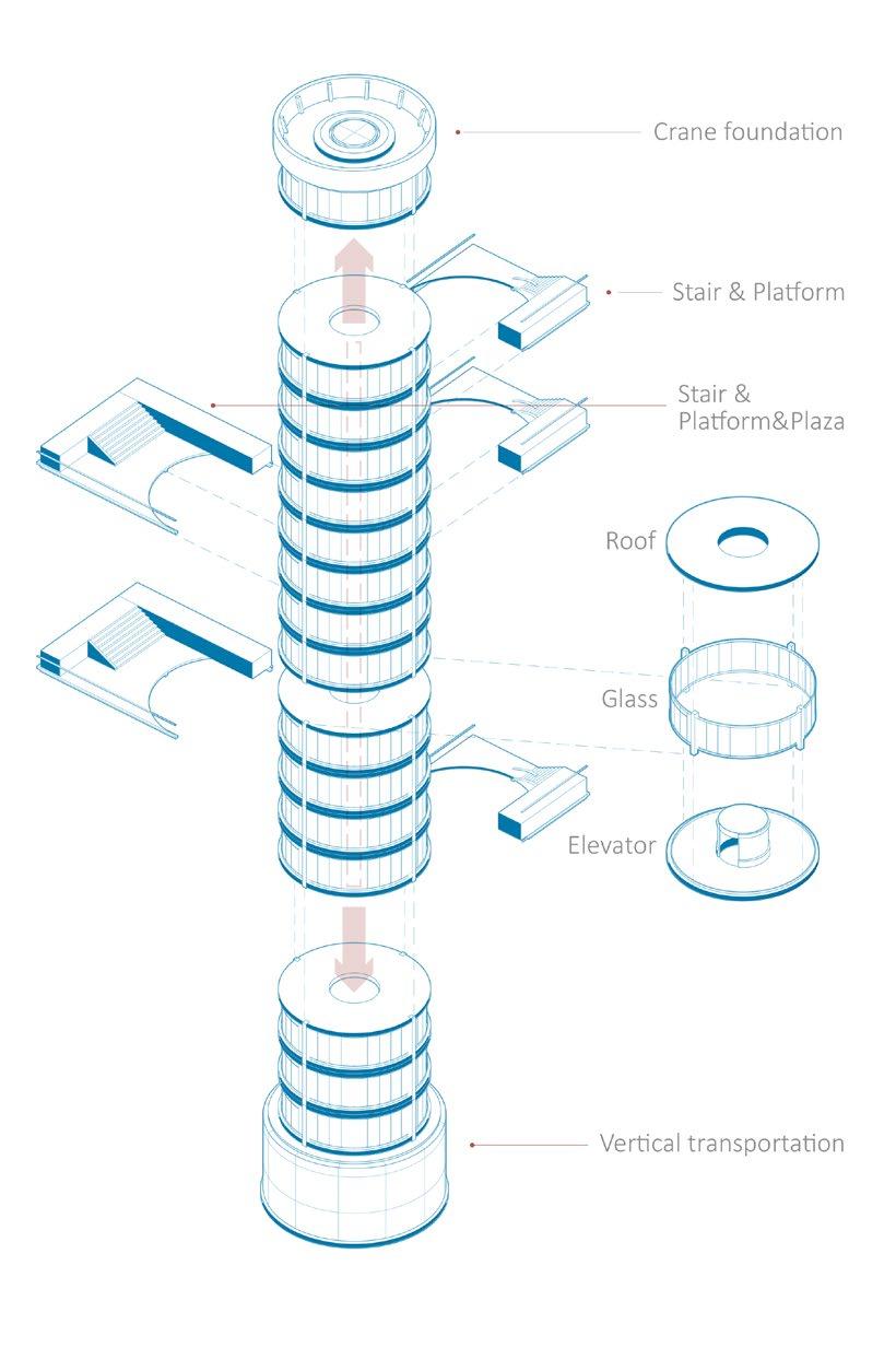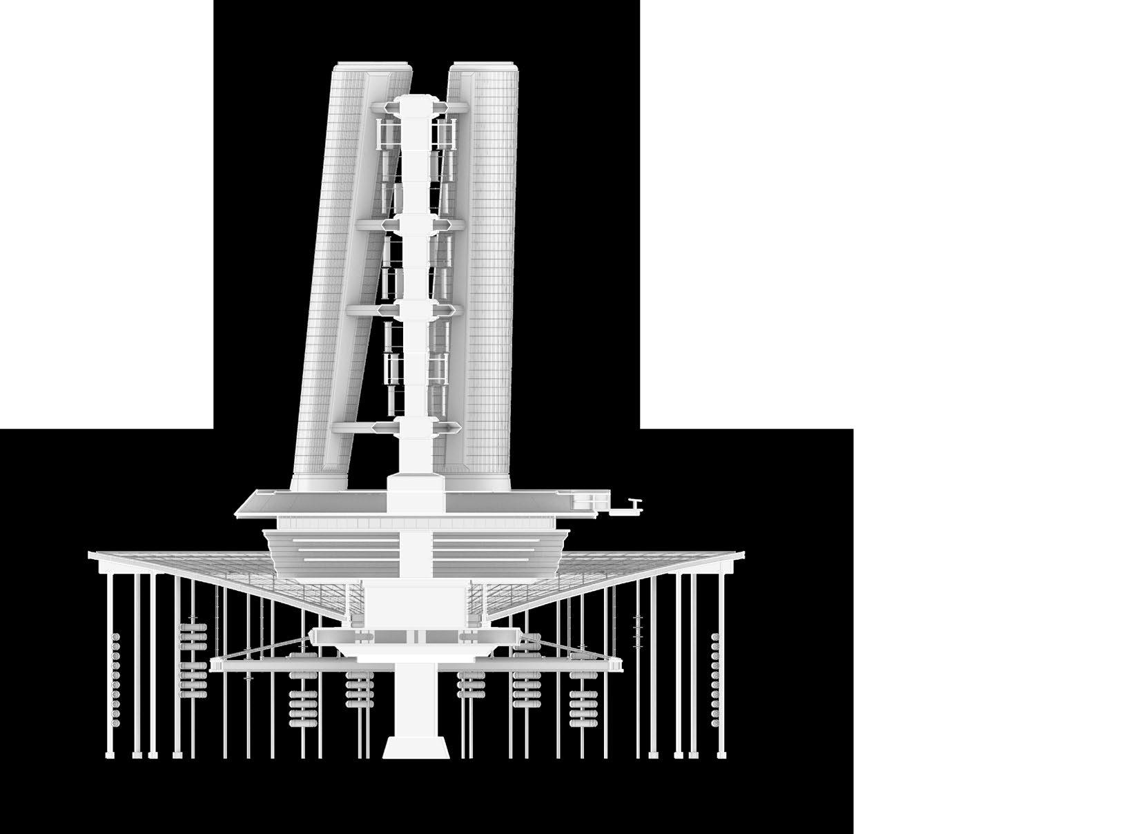 Each production tower plays the role of structural support, vertical transportation and production support