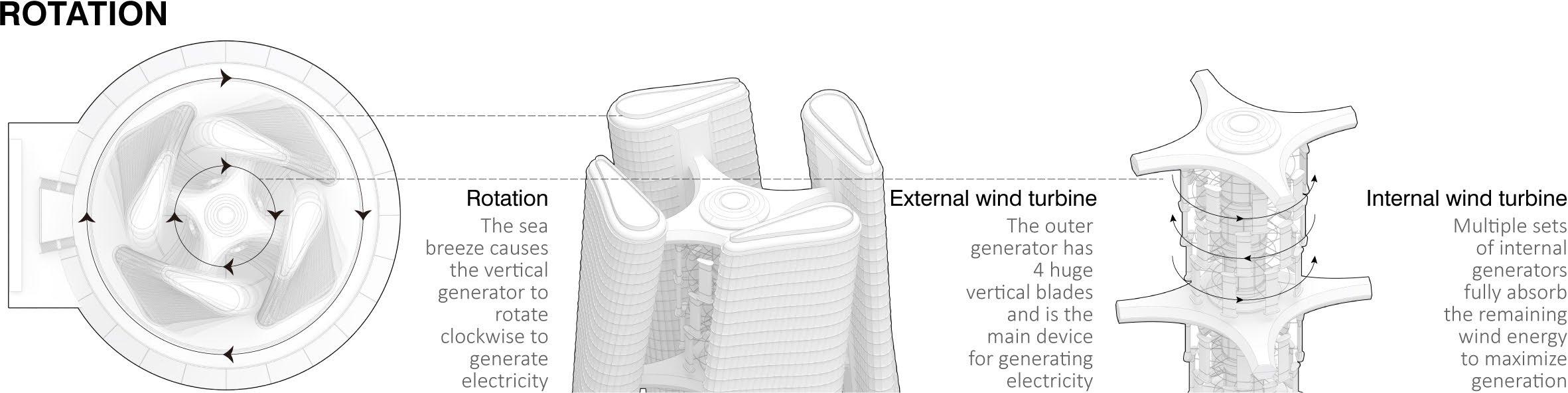 4 giant fan blades are connected by horizontal swivel arms to the tower body to ensure stability during rotation. The central site does not rotate, so it can be used as an operating platform, not only for workers to work on the site, but also as a place for maintenance and cargo stacking. Some activities can also be carried out here