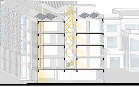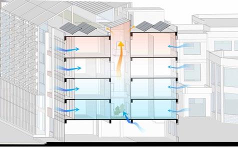 Each dwelling unit is equipped with an energy transmission well to provide and recycle domestic water and to supply electricity generated by photovoltaic panels