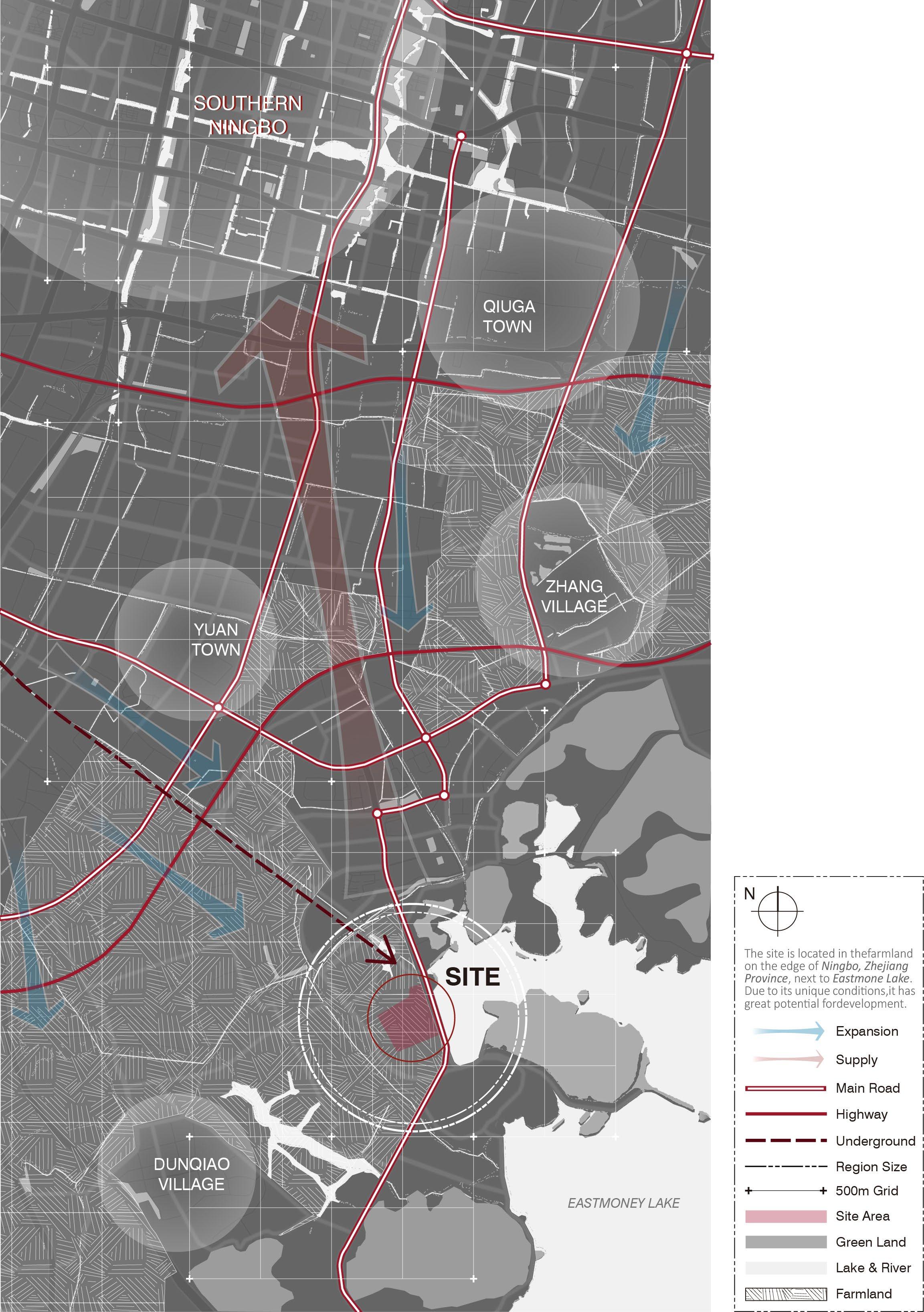 Urban expansion is a historical process that cannot be reversed, and such development has undoubtedly generated more demand for agricultural output, but at the same time, it has inevitably encroached on the original farmland and agricultural resources around the city. As early as the last century, this dual motivation began to produce contradictions, but the early contradictions could only be solved by the destruction of agricultural land and the migration of agricultural populations. With the industrialization of production and the advancement of intelligence, we now have more possibilities to seek new ways out in the land transition zone between urban and rural areas. In these places, believe that the two different existences of urban and agricultural will converge to shape a new production model based on intelligence. Such a model would be universal, increasing agricultural production while also involving local farming populations, with a focus on creating sustainable urban-rural relations.Eastmoney Lake in Ningbo, Zhejiang Province, is located on the edge of the city and has rich plantation and fishing conditions. At present, urban development is gradually encroaching on villages and farmland around the Lake, some small villages have been demolished, but more large ones cannot be moved. So, the local area faces serious problems.