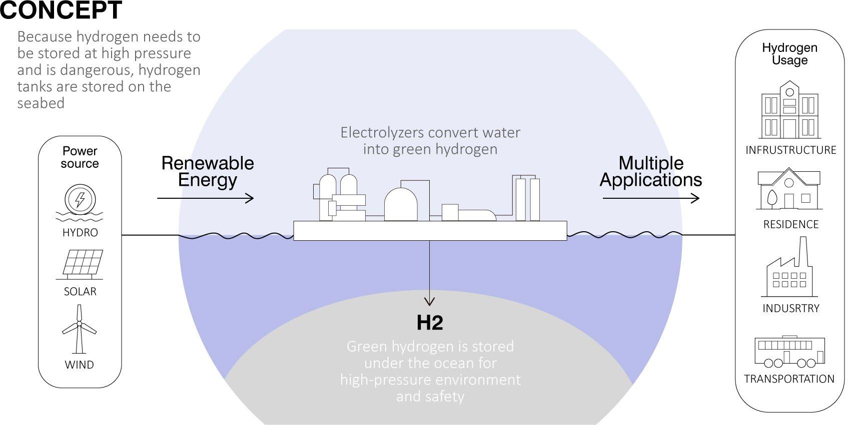 The hydrogen is extracted and stored in the area close to the seabed