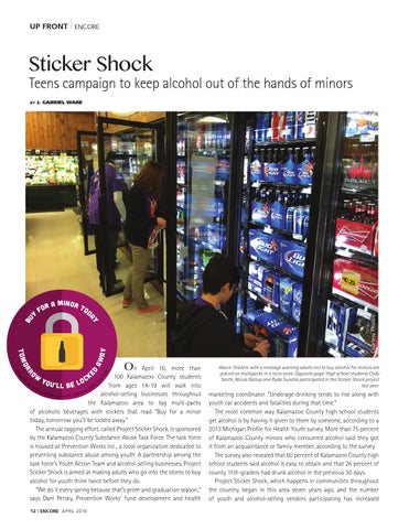 Above: Stickers with a message warning adults not to buy alcohol for minors are n April 16, more than OW placed on multipacks in a local store. Opposite page: High school students Cody 100 Kalamazoo County students K Smith, Gallup and Ryda Sundila participated in the Sticker Shock project o o Y Y T T yo y O O C Nicole ou O O e e L L u s U U last year. E E from ages 14-19 will into ’ ’ u us by bwalk L L B B L L b b y th e th e eA eA K al K al nc nc st a ama ama b st a alcohol-selling businesses throughout coordinator. “Underage drinking tends to rise along with z o o C o u n ty S u b z o o C o u marketing n ty S u the Kalamazoo area to tag multi-packs youth car accidents and fatalities during that time.” of alcoholic beverages with stickers that read “Buy for a minor The most common way Kalamazoo County high school students today, tomorrow you'll be locked away." get alcohol is by having it given to them by someone, according to a The annual tagging effort, called Project Sticker Shock, is sponsored 2013 Michigan Profile for Health Youth survey. More than 75 percent by the Kalamazoo County Substance Abuse Task Force. The task force of Kalamazoo County minors who consumed alcohol said they got is housed at Prevention Works Inc., a local organization dedicated to it from an acquaintance or family member, according to the survey. preventing substance abuse among youth. A partnership among the The survey also revealed that 60 percent of Kalamazoo County high task force’s Youth Action Team and alcohol-selling businesses, Project school students said alcohol is easy to obtain and that 26 percent of Sticker Shock is aimed at making adults who go into the stores to buy county 11th-graders had drunk alcohol in the previous 30 days. alcohol for youth think twice before they do. Project Sticker Shock, which happens in communities throughout “We do it every spring because that’s prom and graduation season,” the country, began in this area seven years ago, and the number says Dani Persky, Prevention Works’ fund development and health of youth and alcohol-selling vendors participating has increased