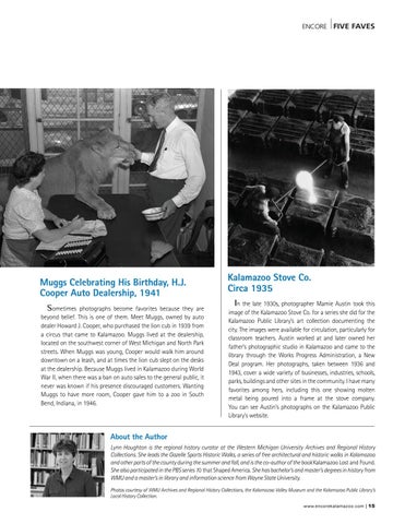 About the Author Lynn Houghton is the regional history curator at the Western Michigan University Archives and Regional History Collections. She leads the Gazelle Sports Historic Walks, a series of free architectural and historic walks in Kalamazoo and other parts of the county during the summer and fall, and is the co-author of the book Kalamazoo Lost and Found. She also participated in the PBS series 10 that Shaped America. She has bachelor’s and master’s degrees in history from WMU and a master’s in library and information science from Wayne State University. Photos courtesy of WMU Archives and Regional History Collections, the Kalamazoo Valley Museum and the Kalamazoo Public Library’s Local History Collection. w w w.encorekalamazoo.com | 15