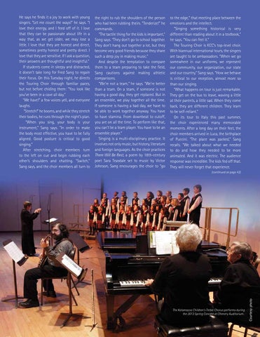 to the edge,” that meeting place between the emotions and the intellect. “Singing something historical is very different than reading about it in a textbook,” he says. “You can feel it.” The Touring Choir is KCC’s top-level choir. With biannual international tours, the singers are taught to be ambassadors. “When we go somewhere in our uniforms, we represent our community, our organization, our state and our country,” Sang says. “How we behave is critical to our reception, almost more so than our singing. “What happens on tour is just remarkable. They get on the bus to leave, waving a little at their parents, a little sad. When they come back, they are different children. They learn to be self-reliant.” On its tour to Italy this past summer, the choir experienced many memorable moments. After a long day on their feet, the choir members arrived in Luca, the birthplace of Puccini. “The place was packed,” Sang recalls. “We talked about what we needed to do and how they needed to be more animated. And it was electric. The audience response was incredible. The kids fed off that. They will never forget that experience. (continued on page 43)