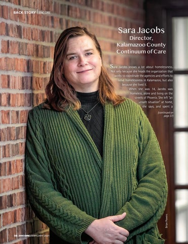 Not only because she heads the organization that works to coordinate the agencies and efforts to solve homelessness in Kalamazoo, but also because she lived it. When she was 14, Jacobs was homeless, alone and living on the streets of Phoenix. She left “an unsafe situation� at home, she says, and spent a (continued on page 37)