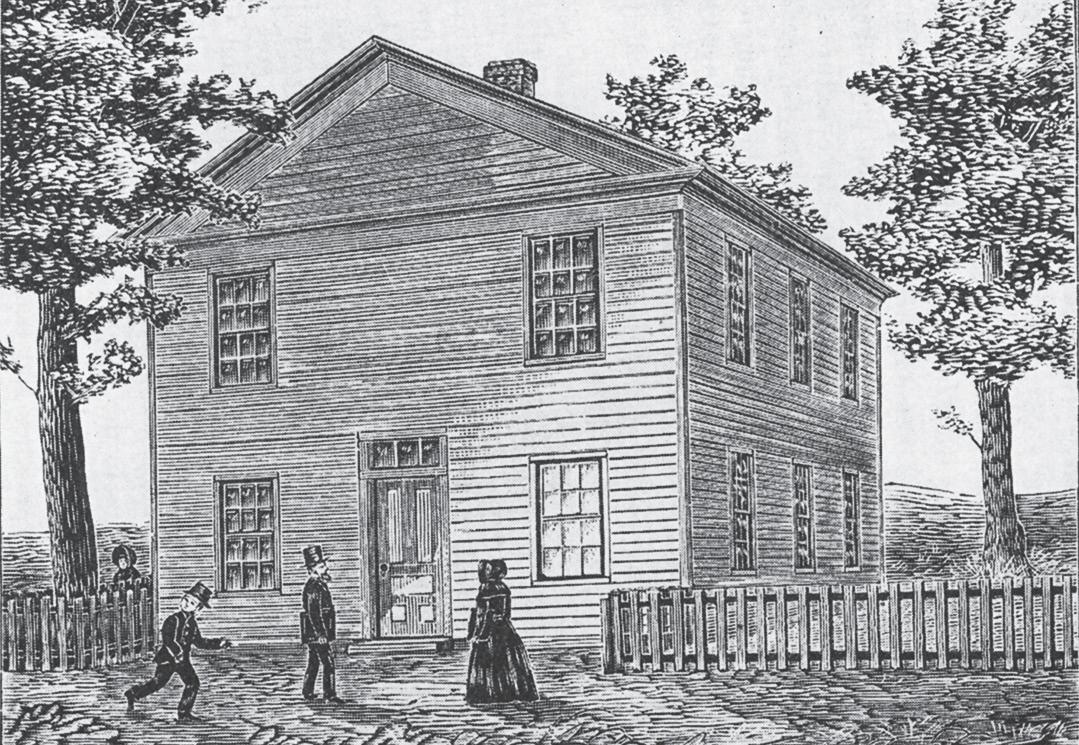 By the time Michigan became a state in 1837, plans for a statewide education system were in place, which included establishing branches that would prepare male students for the University of Michigan, train teachers, provide agricultural education for farmers and education for women. Eight communities were chosen for these branches, including Kalamazoo, which opened a school in 1838 in this wooden building on the east side of what is now Bronson Park. Eventually the state withdrew support for the branches, and the local school merged with the Kalamazoo Literary Institute, which had opened as the Michigan and Huron Institute in 1833. Renamed Kalamazoo College in 1855, the building continued to be used until 1856, when it was moved to another site and continued to serve as a school.