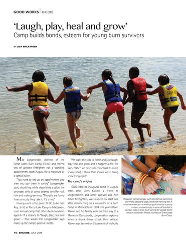 ike Longenecker, director of the Great Lakes Burn Camp (GLBC) and retired city of Jackson firefighter, has a standing appointment each August for a manicure at a special salon. “You have to set up an appointment and then you pay them in candy,” Longenecker says, chuckling, while describing a salon the youngest girls at camp opened to offer nail, hair and makeup services. “The girls are funny how seriously they take it. It’s a riot.” Having a riot is the point. GLBC, to be held Aug. 5-10 at Pretty Lake Camp in Mattawan, is an annual camp that offers burn survivors ages 6-17 a chance to “laugh, play, heal and grow” — four words that Longenecker says make up the camp’s positive motto. 16 | ENCORE JULY 2018