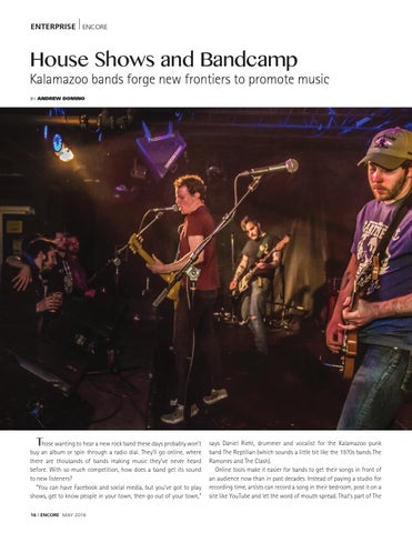 hose wanting to hear a new rock band these days probably won’t buy an album or spin through a radio dial. They’ll go online, where there are thousands of bands making music they’ve never heard before. With so much competition, how does a band get its sound to new listeners? “You can have Facebook and social media, but you’ve got to play shows, get to know people in your town, then go out of your town,” 16 | ENCORE MAY 2016