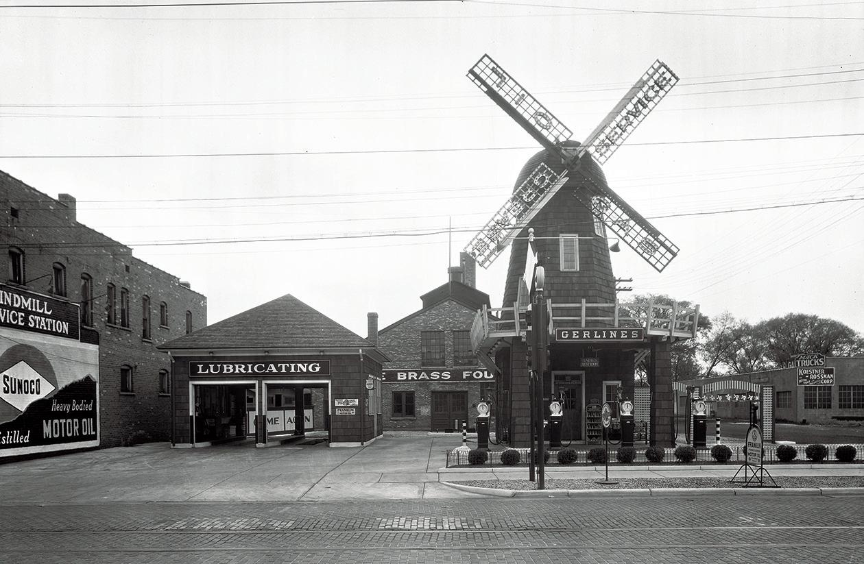 This is definitely one of the most unusual gas stations ever to exist in Kalamazoo. In 1928, Otto Gerline, owner of the brass foundry in the photograph, opened the station, located on East Michigan Avenue east of downtown. The station was designed by the architectural firm Rockwell LeRoy and Manuel Newlander, and its exterior featured a windmill design that had four rotating blades decorated with blue and yellow lights. A separate building provided lubrication, with drive-through service. Souvenirs distributed at the station's grand opening included photographs of Gerline and his saxophone. Large advertisements promoting the station’s services were published in the Kalamazoo Gazette on a regular basis, and the station's blue lights could be seen from a distance. The station was listed in the Kalamazoo city directory in 1938 but not in 1939.