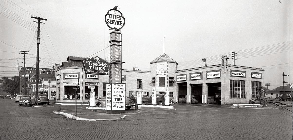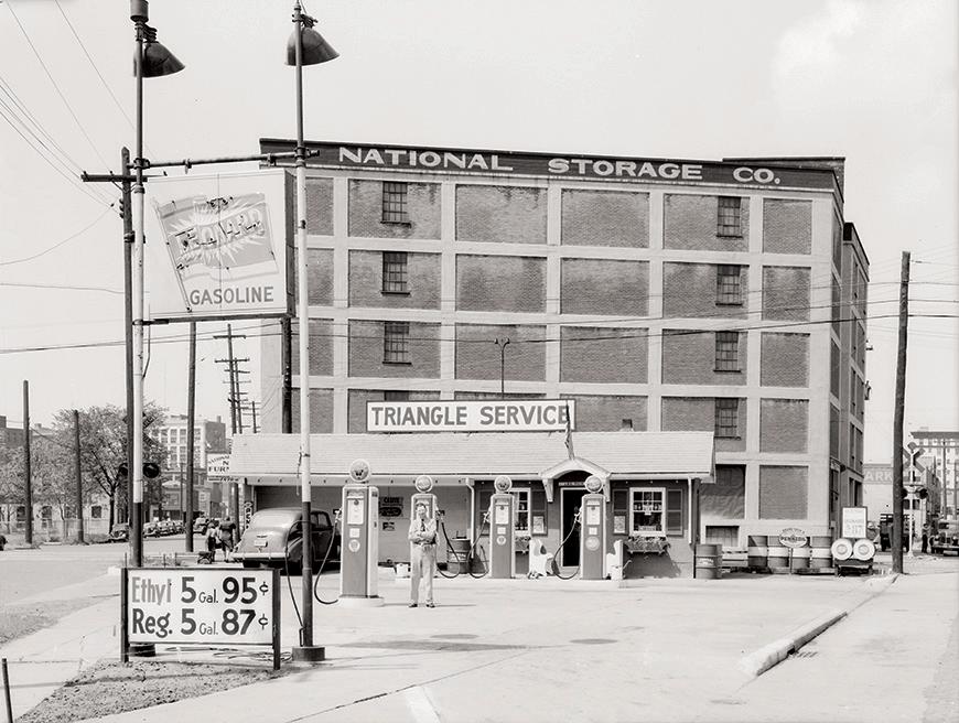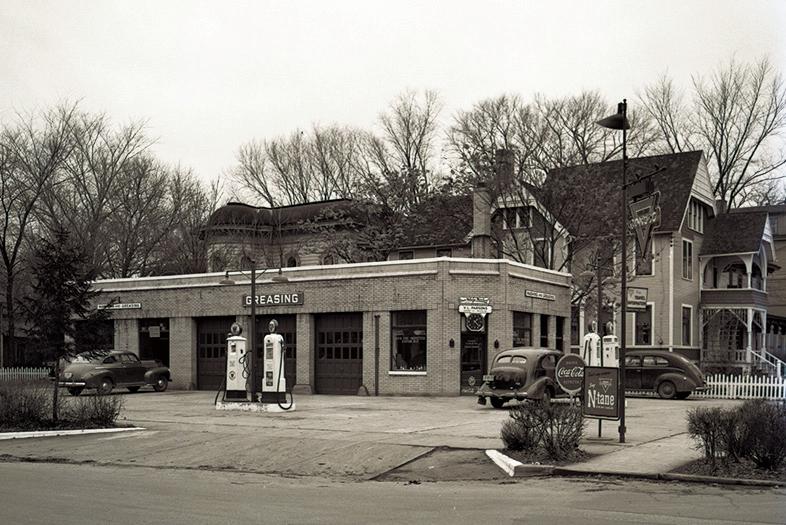 This gas station, originally called the Colonial Oil Co., was located at the intersection of East Water Street and East Kalamazoo Avenue. At its opening on Nov. 29, 1930, it offered seven gallons of gas for $1, plus souvenirs for everyone, including ladies and children. The name of the station changed over the years, but the name that stuck the longest and was the most appropriate was the Triangle Service Station. Lester Rice, who stands proudly in this photograph, owned the station for 32 years. Along with gas and greasing services, the station might also have a used car or two for sale and offer premiums like drinking glasses. Moving into this space in 1993 was Water Street Coffee Joint, where customers still fill up but in a different way.