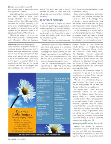 Libraries (continued from page 29) and scholarly work by Kalamazoo College faculty, staff and students.” Upjohn Library often exchanges materials with WMU’s Dwight B. Waldo Library through interlibrary loan and reciprocal lending privileges. Upjohn Library also offers databases for research, including a free search engine called Google Scholar. E-books are popular in the academic world too. “We reported 102,970 electronic books in our collection on last count,” Nowicki says. “Most of our resources can be accessed from campus, of course,” says Greg Diment, chief information officer at Kalamazoo Community (continued from page 19) at risk for various developmental delays and emotional disorders. Reames says that by making home visits, therapists are “in on the ground level. You can learn so much more about what’s happening in the environment if you’re actually there. What kind of things is this parent up against? What is the neighborhood like? What are her natural supports? What are the challenges? What other children are there in the family?”