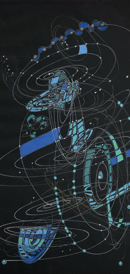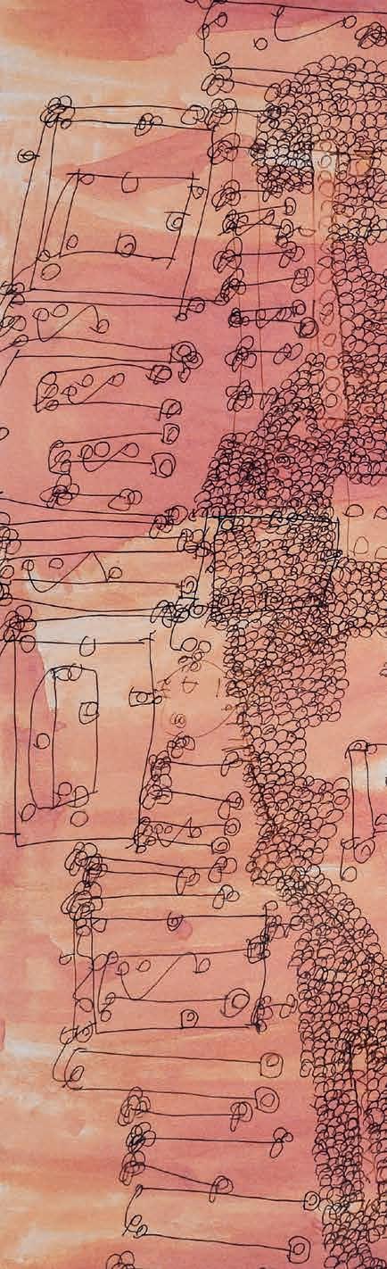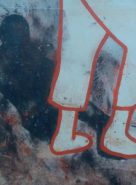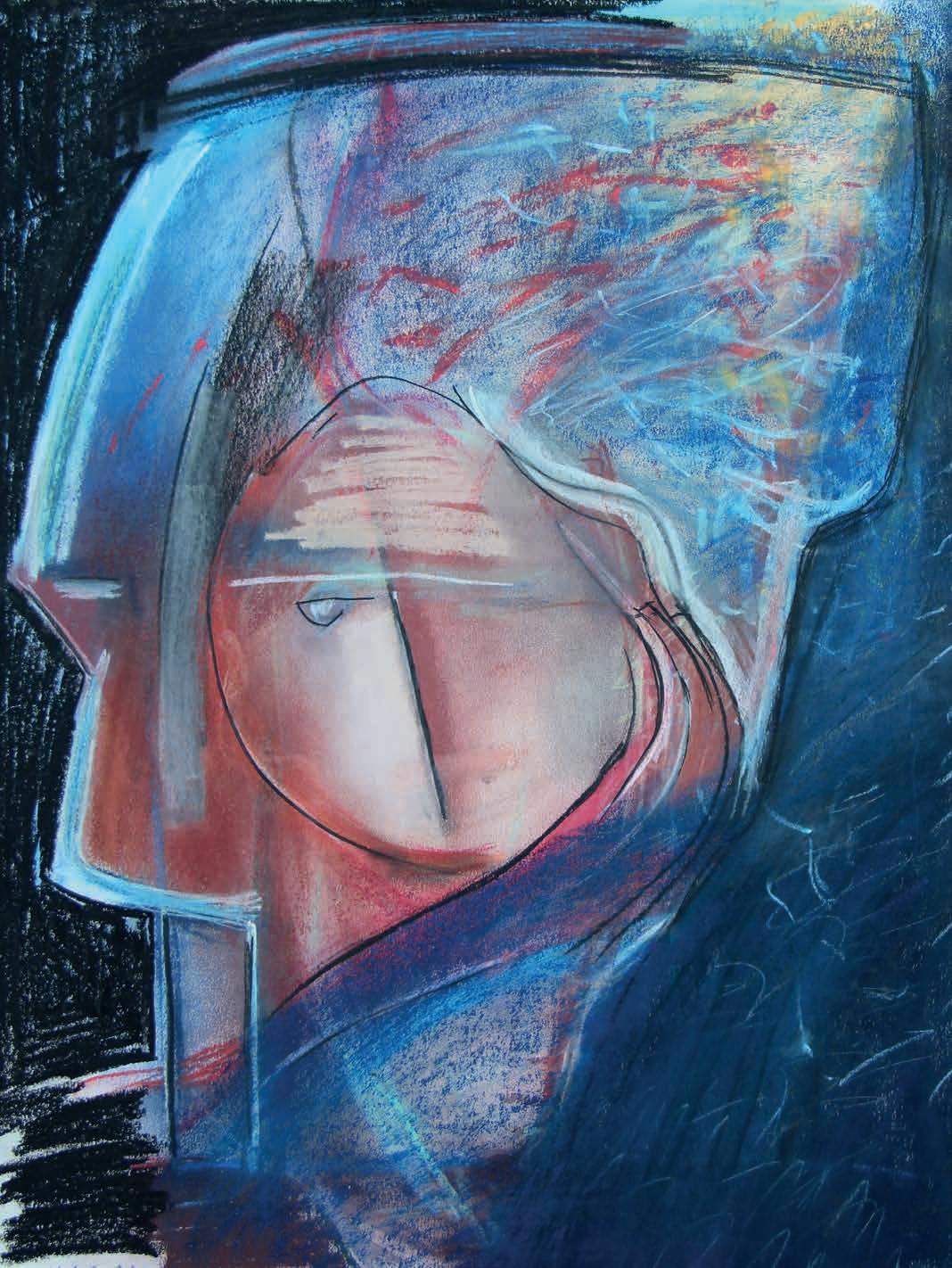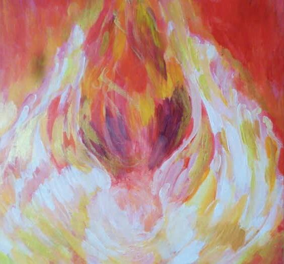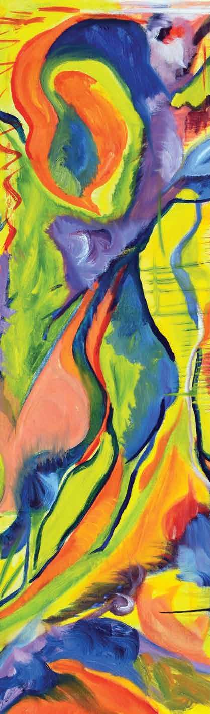 De op- en neerwaartse vloeiende bewegingen brengen me op een natuurlijke wijze langs zijsporen. Ik bewandel en volg. Op ieder moment in mijn ‘zijn’ ontdek ik kracht, de kracht van vorm, van kleur, van perspectief. Ik laat stroming toe. De stroming van mijn leven. In overgave.