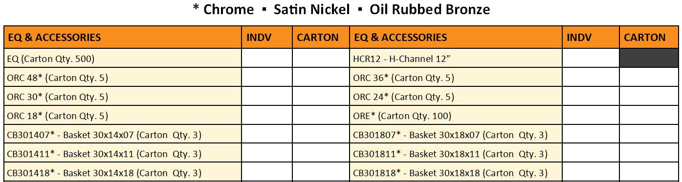 Name: PhoneP.O.Vendor:_____________________________________________________________________________________________#:_______________________________________________#:_____________________________________________ * Chrome ▪ Satin Nickel ▪ Oil Rubbed Bronze EQ & ACCESSORIES INDV CARTON EQ & ACCESSORIES INDV CARTON EQ (Carton Qty. 500) HCR12 H Channel 12” ORC 48* (Carton Qty. 5) ORC 36* (Carton Qty. 5) ORC 30* (Carton Qty. 5) ORC 24* (Carton Qty. 5) ORC 18* (Carton Qty. 5) ORE* (Carton Qty. 100) CB301407* Basket 30x14x07 (Carton Qty. 3) CB301807* Basket 30x18x07 (Carton Qty. 3) CB301411* Basket 30x14x11 (Carton Qty. 3) CB301811* Basket 30x18x11 (Carton Qty. 3) CB301418* Basket 30x14x18 (Carton Qty. 3) CB301818* Basket 30x18x18 (Carton Qty. 3) CB241407* Basket 24x14x07 (Carton Qty. 3) CB241807* Basket 24x18x07 (Carton Qty. 3) CB241411* Basket 24x14x11 (Carton Qty. 3) CB241811* Basket 24x18x11 (Carton Qty. 3) CB241418* Basket 24x14x18 (Carton Qty. 3) CB241818* Basket 24x18x18 (Carton Qty. 3) CB181407* Basket 18x14x07 (Carton Qty. 3) CB181807* Basket 18x18x07 (Carton Qty. 3) CB181411* Basket 18x14x11 (Carton Qty. 3) CB181811* Basket 18x18x11 (Carton Qty. 3) CB181418* Basket 18x14x18 (Carton Qty. 3) CB181818* Basket 18x18x18 (Carton Qty. 3) BRC 14* Belt Rack CBSR 14* Belt Scarf Organizer CTR 14* Tie/Scarf Organizer CVR 14* Valet Rod TBC 14 TCR Tie/Belt Rack with Tray TRC 14* Tie Rack PSC 3014CR Pull Out Pant Rack 30” Wide PSC 2414CR Pull Out Pant Rack 24” Wide PSC 1814CR Pull Out Pant Rack 18” Wide 128mm Drawer/Door Handle* SHOE RAILS & SHELVES INDV COLOR SHOE RAILS & SHELVES INDV COLOR WSR30* Wire Shoe Rail 30” WSR36* Wire Shoe Rail 36” WSR18* Wire Shoe Rail 18” WSR24* Wire Shoe Rail 24” 1436SF w/ Shoe Rail Holes 1836SF w/ Shoe Rail Holes 1430S w/ Shoe Rail Holes 1830S w/ Shoe Rail Holes 1424S w/ Shoe Rail Holes 1824S w/ Shoe Rail Holes 1418S w/ Shoe Rail Holes 1818S w/ Shoe Rail Holes 1436SF Bottom Shelf w/ Shoe Rail Holes 1836SF Bottom Shelf w/ Shoe Rail Holes 1430S Bottom Shelf w/ Shoe Rail Holes 1830S Bottom Shelf w/ Shoe Rail Holes 1424S Bottom Shelf w/ Shoe Rail Holes 1824S Bottom Shelf w/ Shoe Rail Holes 1418S Bottom Shelf w/ Shoe Rail Holes 1818S Bottom Shelf w/ Shoe Rail Holes WEDGERAIL INDV CARTON WEDGERAIL INDV CARTON WRU8 Wedgerail (Carton Qty. 10) WRC48 48” Wedgerail Cover (Carton Qty. 28) WRC36 36” Wedgerail Cover (Carton Qty. 28) WRC30 30” Wedgerail Cover (Carton Qty. 28) WRC24 24” Wedgerail Cover (Carton Qty. 28) WRC18 18” Wedgerail Cover (Carton Qty. 28) SHOE ORGANIZER INDV SHOE ORGANIZER INDV CLSZ W3.55 55” Women’s Shoe Organizer CLSZ M3.55 55” Men’s Shoe Organizer CLSZ W5.96 96” Women’s Shoe Organizer CLSZ M5.96 96” Men’s Shoe Organizer CLSZ W1 Women’s Shoe Organizer Shelf CLSZ M1 Men’s Shoe Organizer Shelf Lifespanclosets.comPage 27