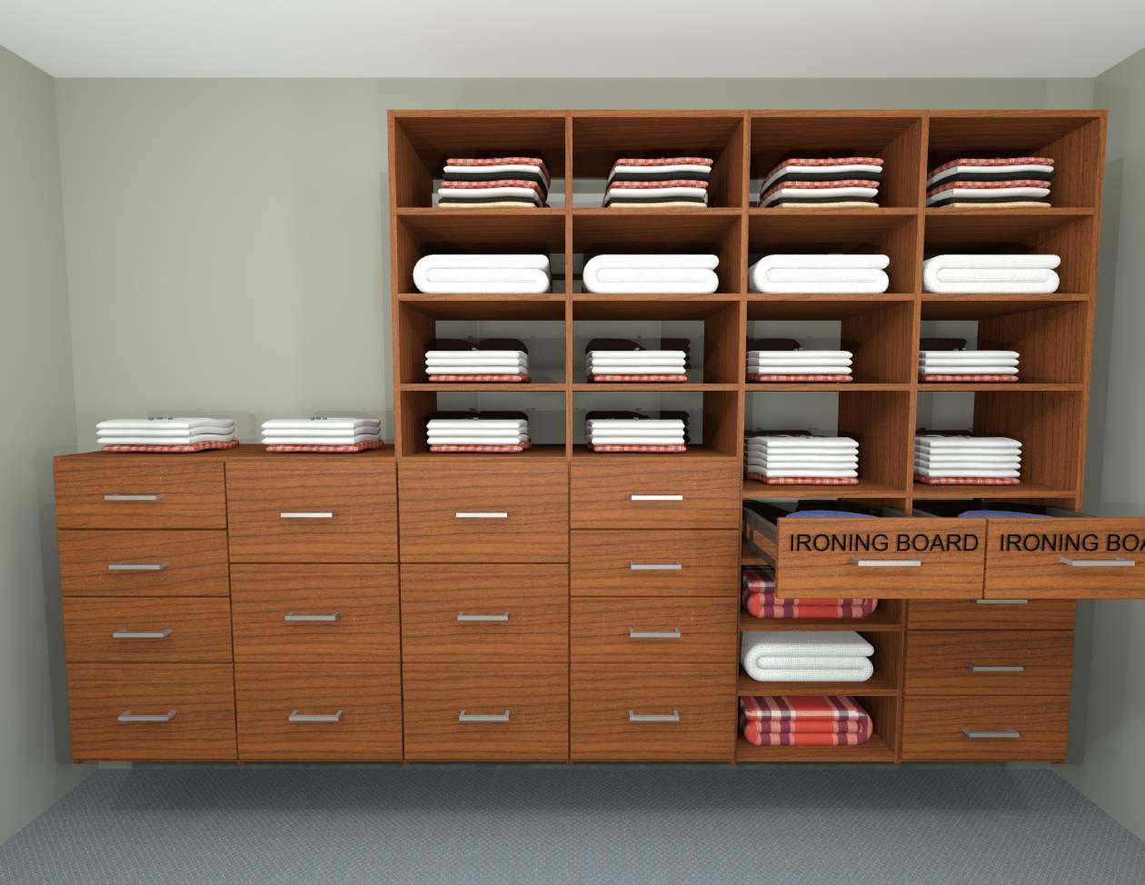 3.f 72 Ironing board with shelves and drawers. 72” Unit height/ installed 12” above floor level/ 84” total height.