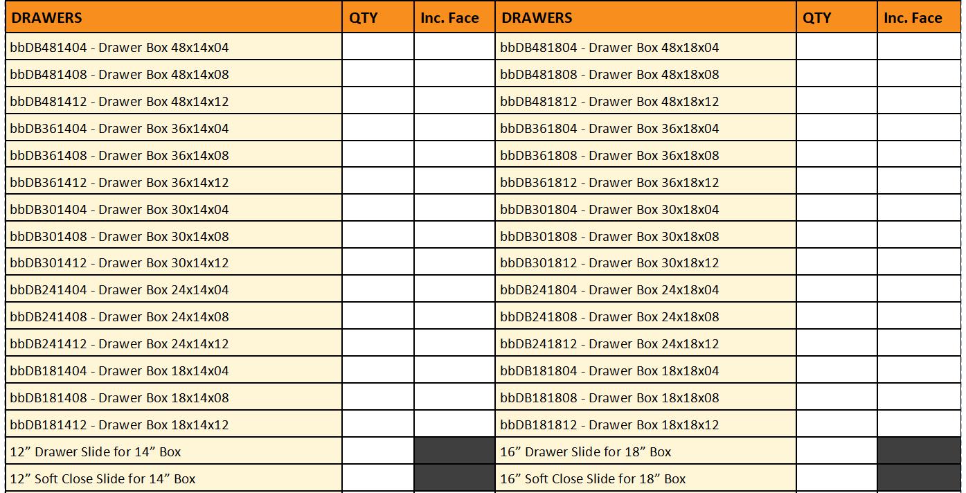 Name: PhoneP.O.Vendor:_____________________________________________________________________________________________#:_______________________________________________#:_____________________________________________ WM ▪ AM ▪ CM ▪ HM ▪ ACT ▪ BT ▪ CRT ▪ ET ▪ GNT ▪ GPT ▪ MET ▪ PWT ▪ TTT 24” PARTITIONS INDV 24” SHELVES INDV 2496Ptk 2448SF 2496LEtk 2436SF 2496REtk 2430S 2484Ptk 2424S 2484LEtk 2418S 2484REtk 2436SF w/ Shoe Rail Holes 0424Side Base 2430S w/ Shoe Rail Holes 2424S w/ Shoe Rail Holes 2418S w/ Shoe Rail Holes 2448Bottom Shelf 2436Bottom Shelf 2430Bottom Shelf 2424Bottom Shelf 2418Bottom Shelf 24” DRAWERS QTY Inc. Face 24” DRAWERS QTY Inc. Face bbDB482404 Drawer Box 48x24x04 bbDB362404 Drawer Box 36x24x04 bbDB482408 Drawer Box 48x24x08 bbDB361808 Drawer Box 36x24x08 bbDB481412 Drawer Box 48x24x12 bbDB361812 Drawer Box 36x24x12 bbDB302404 Drawer Box 24x30x04 bbDB242404 Drawer Box 24x24x04 bbDB302408 Drawer Box 24x30x08 bbDB242408 Drawer Box 24x24x08 bbDB302412 Drawer Box 24x30x12 bbDB242412 Drawer Box 24x24x12 bbDB182404 Drawer Box 18x24x04 22” Drawer Slide for 24” Box bbDB182408 Drawer Box 18x24x08 22” Soft Close Slide for 24” Box bbDB182412 Drawer Box 18x24x12 Page 28Lifespanclosets.com