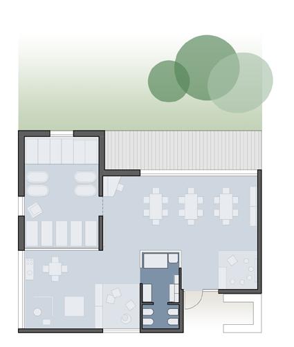 I servizi igienici possono essere organizzati in un unico nucleo condiviso da entrambe le sezioni.
