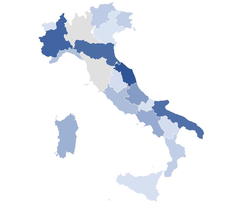 Abruzzo 24 Basilicata 2 Calabria 7 Campania 19 Emilia-Romagna 40 Friuli-Venezia Giulia 7 Lazio 13 Liguria 12 Lombardia Marche 48 Molise 1 Piemonte 43 Puglia 39 Sardegna 17 Sicilia 1 Toscana Trentino-Alto Adige/Südtirol 8 Umbria 2 Valle d'Aosta/Vallée d'Aoste 1 Veneto 0 Totale 284