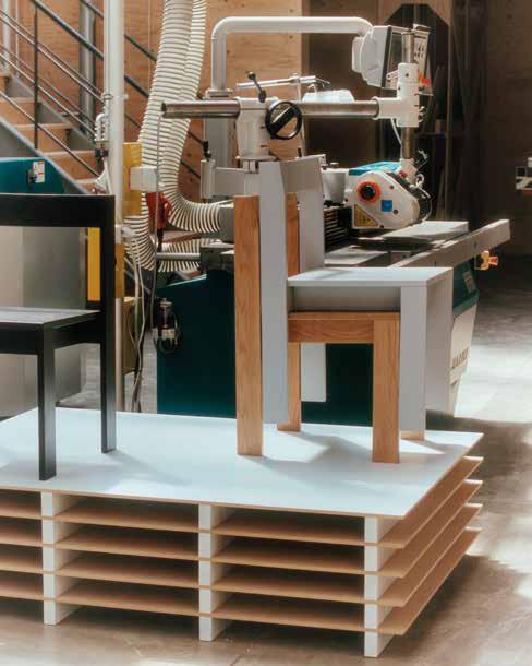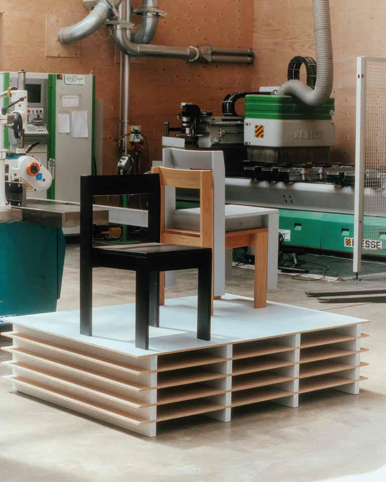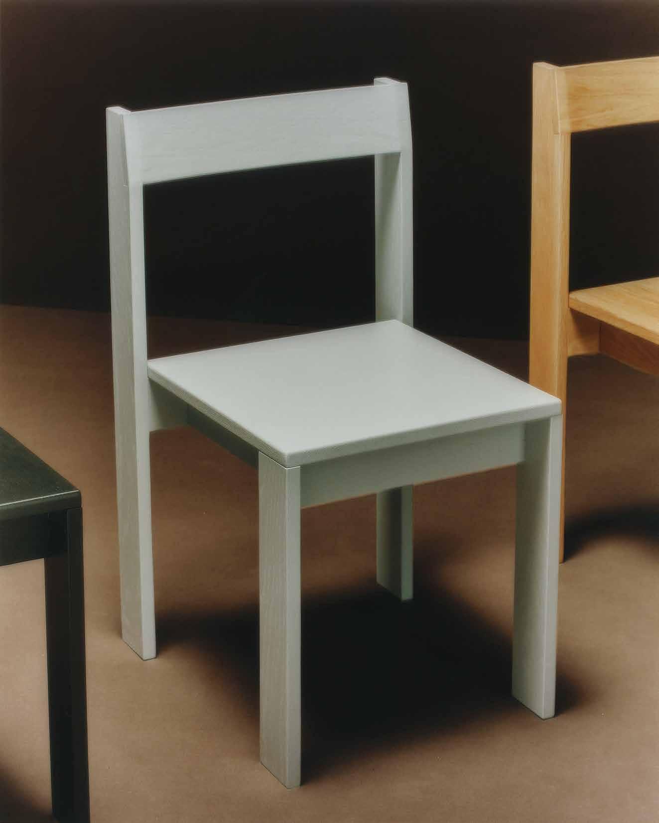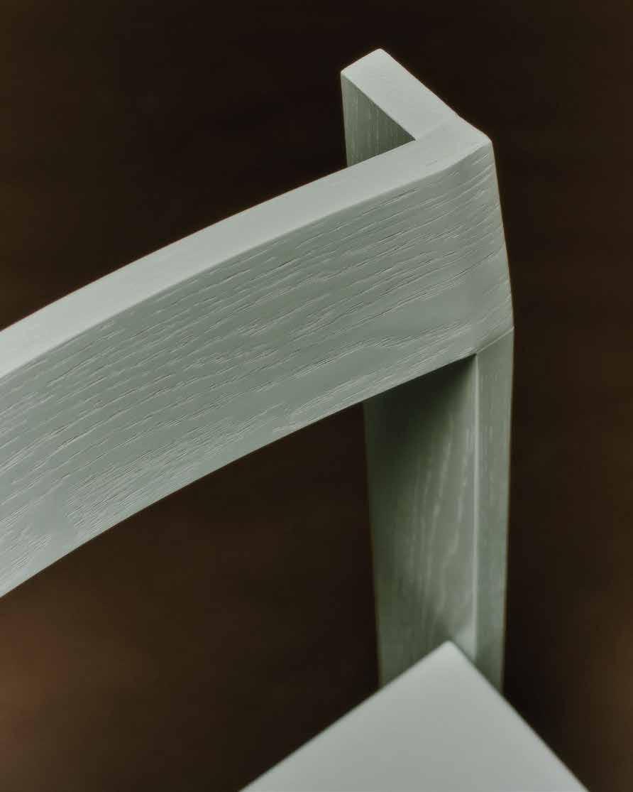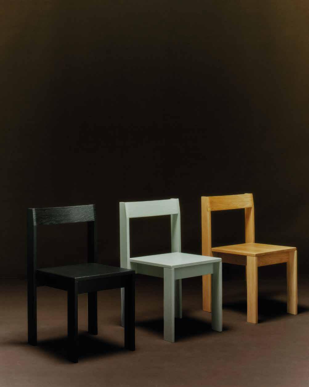 Characterized by their calm symmetry and sturdy construction, the chairs embody simple, contemporary design. The focus of the design is on function, relying on wood, a traditional materialwith soft, comfortable, and modern sculptural values.
