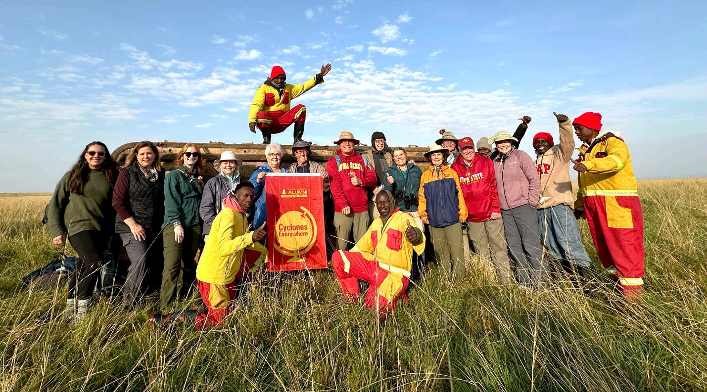 Our group of Traveling Cyclones pose with the hot air balloon basket and staff (dressed appropriately in cardinal and gold) after our ride over Kenya’s Masai Mara.