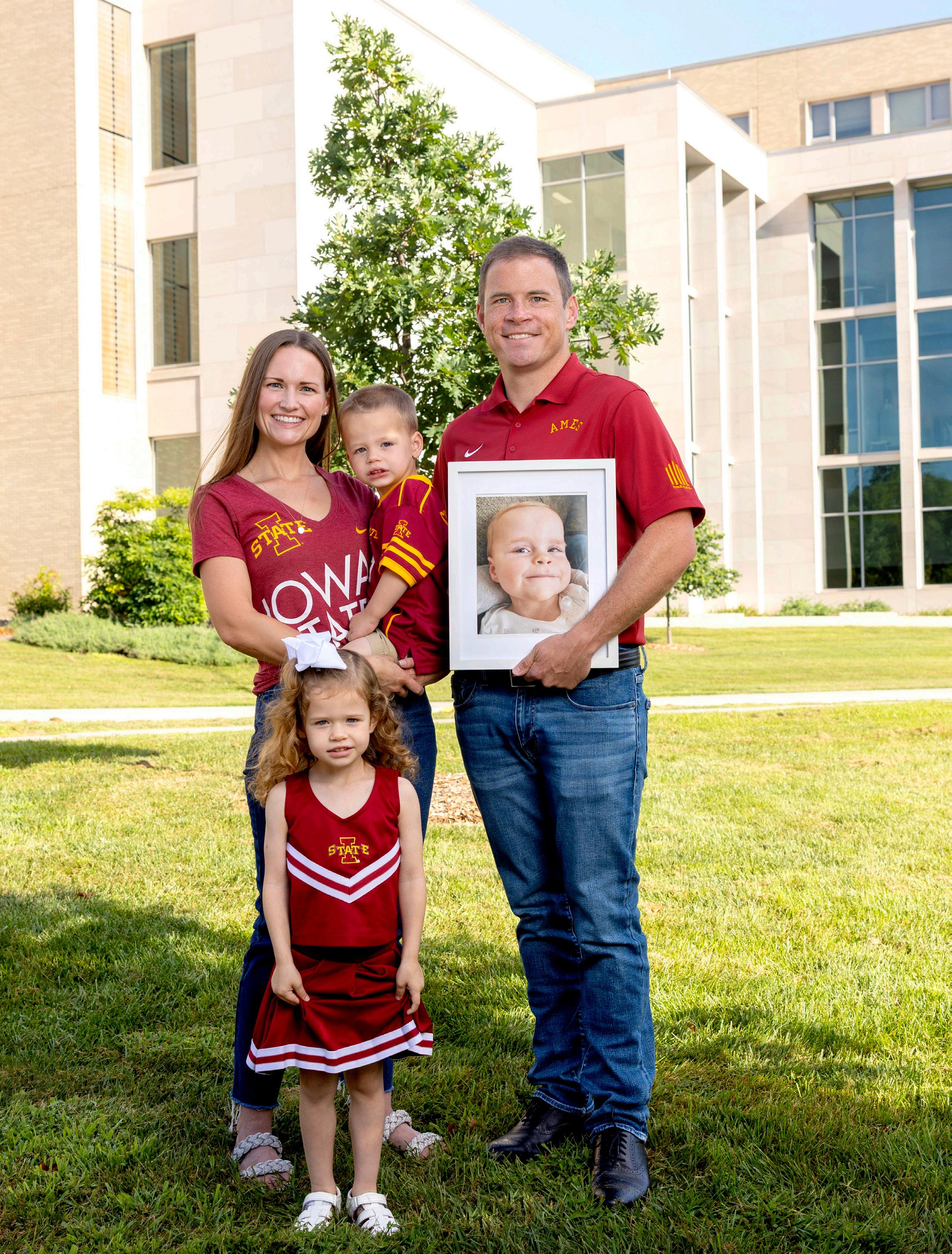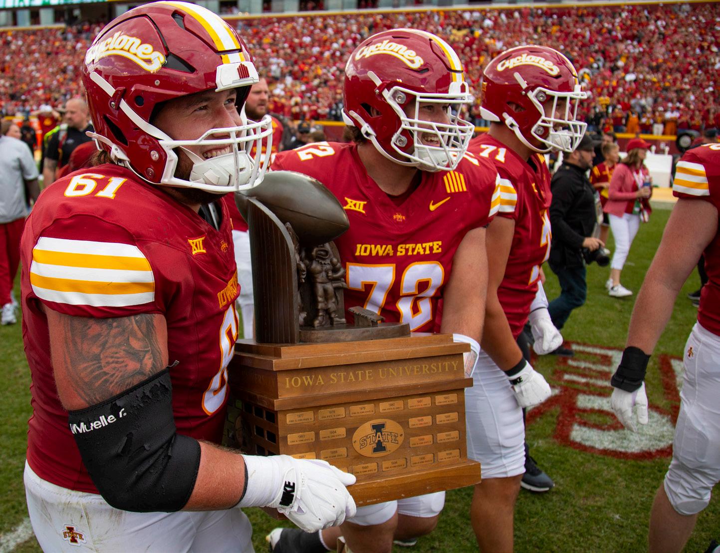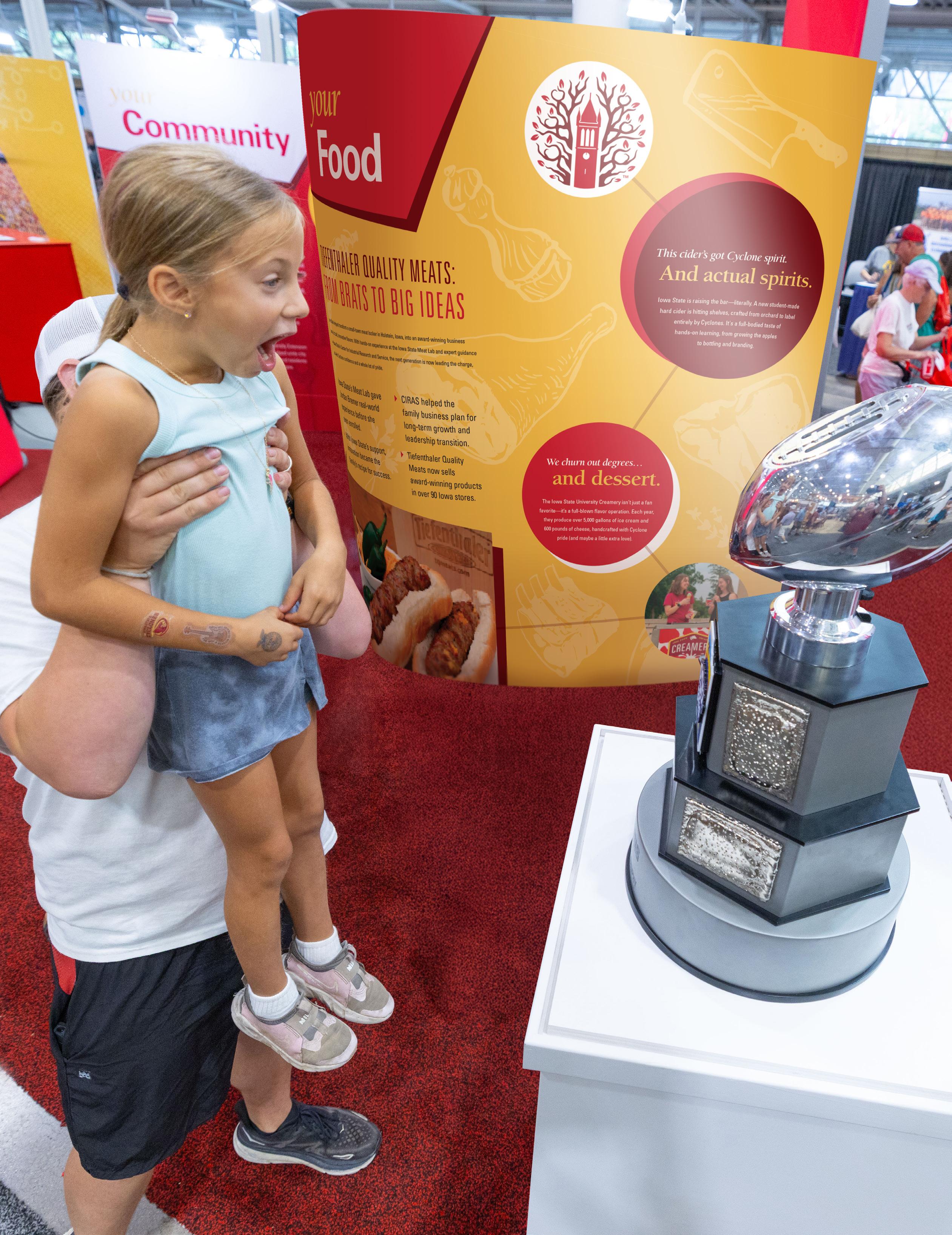 Brexley Sims reacts to the Cyclones’ Pop Tarts Bowl championship trophy while being lifted up by her uncle, Aaron Gernetzke, at the Iowa State University exhibit at the 2025 Iowa State Fair. Over 50,000 Cyclone tattoos, 37,000 football posters, 20,000 ISU bags, 10,000 Pop-Tarts®, and 55 teacher kits were distributed to fairgoers by Iowa State University volunteers and staff.