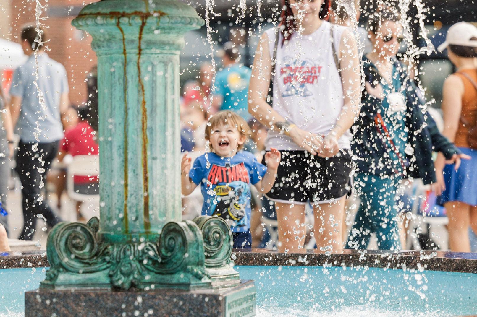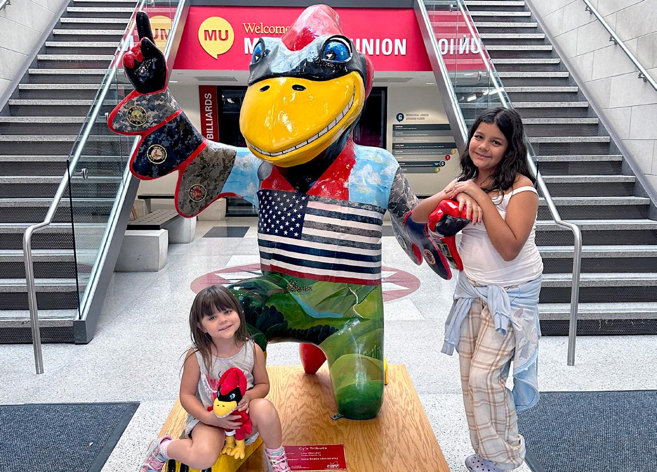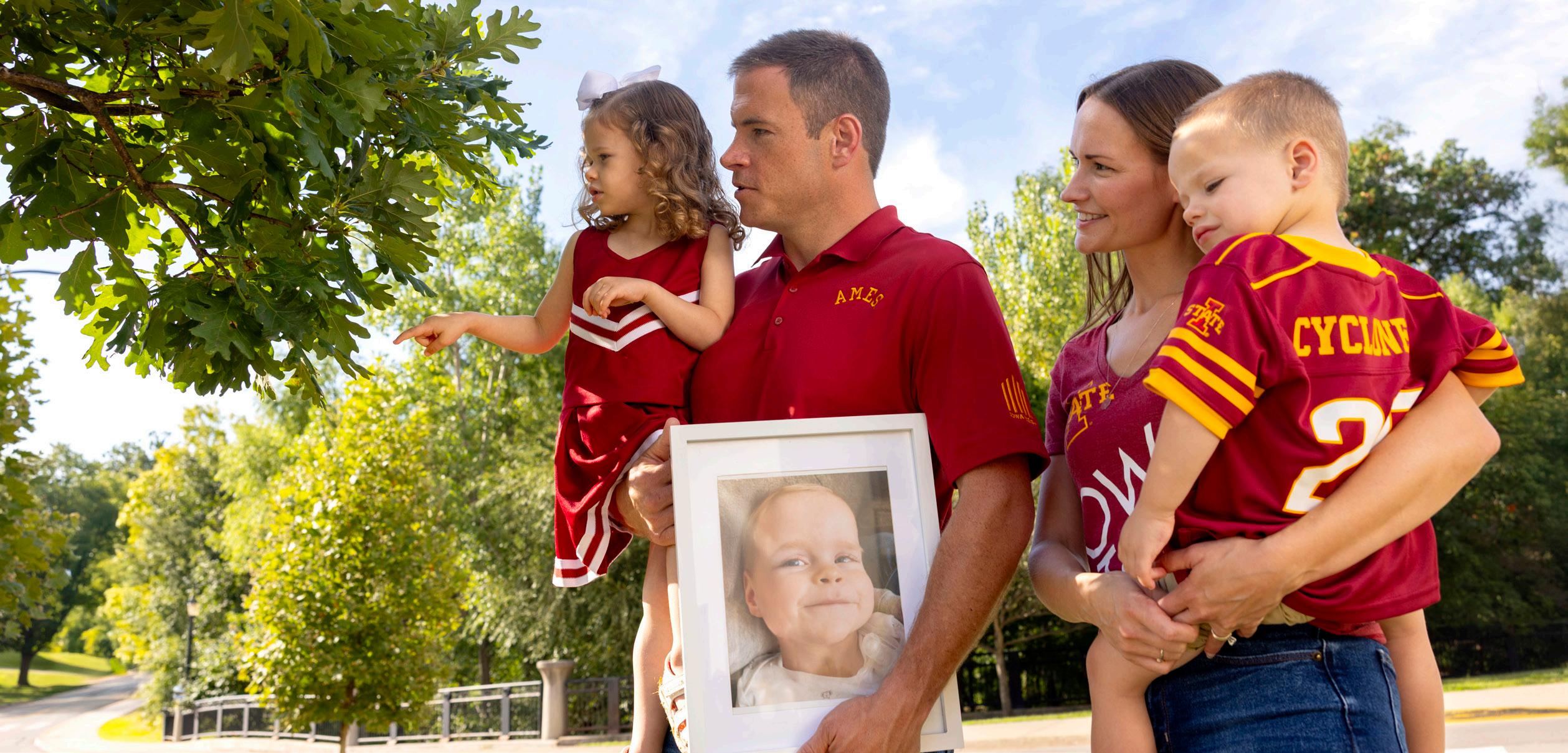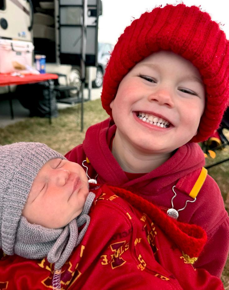 Brexley Sims reacts to the Cyclones’ Pop Tarts Bowl championship trophy while being lifted up by her uncle, Aaron Gernetzke, at the Iowa State University exhibit at the 2025 Iowa State Fair. Over 50,000 Cyclone tattoos, 37,000 football posters, 20,000 ISU bags, 10,000 Pop-Tarts®, and 55 teacher kits were distributed to fairgoers by Iowa State University volunteers and staff.