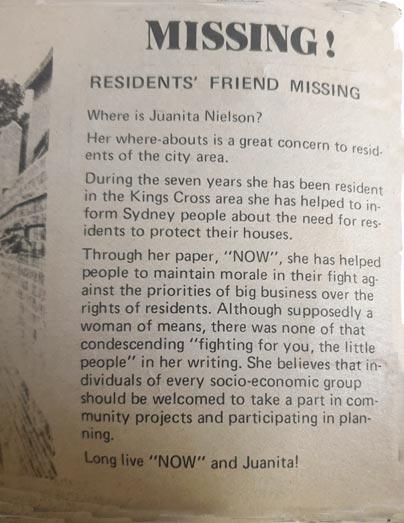 Juanita Nielsen’s disappearance reported in early edition of Inner Sydney Action