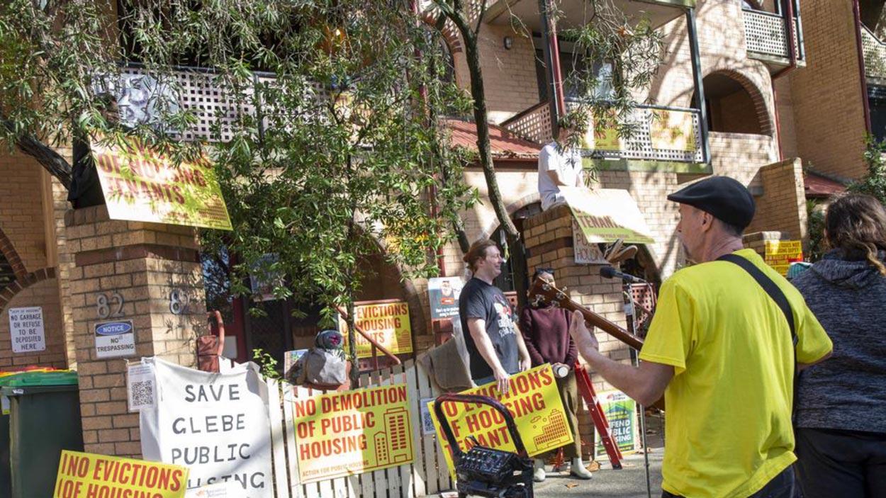 PROTEST OUTSIDE PUBLIC HOUSING IN WENTWORTH ROAD GLEBE SLATED FOR DEMOLITION AMID ONGOING HOUSING CRISIS, JUNE 2023