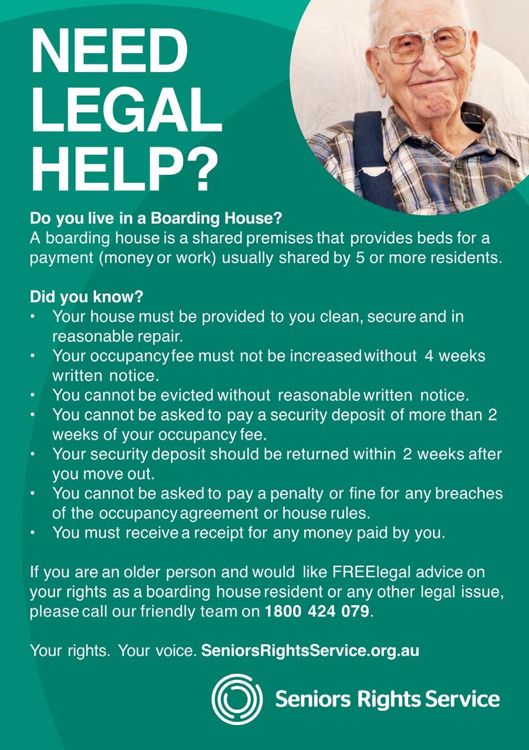 n To request a visit from the Boarding House Project at a local service near you, call 9281 3600 or 1800 424 079 (press 2 for the Legal Team) or email legal@seniorsrightsservice.org.au