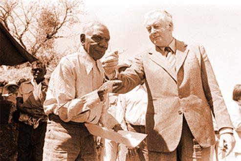 A Royal Commission into Land Rights is established by the Whitlam Labor government. After years of struggle and lobbying, Gurindji man Vincent Lingiari is given back his land by Prime Minister Gough Whitlam in 1975. Following the failure of the Gove lands rights case, the Whitlam government instigated an inquiry into Aboriginal land rights (known as the Woodward Commission), which eventually led to the Fraser Liberal government passing