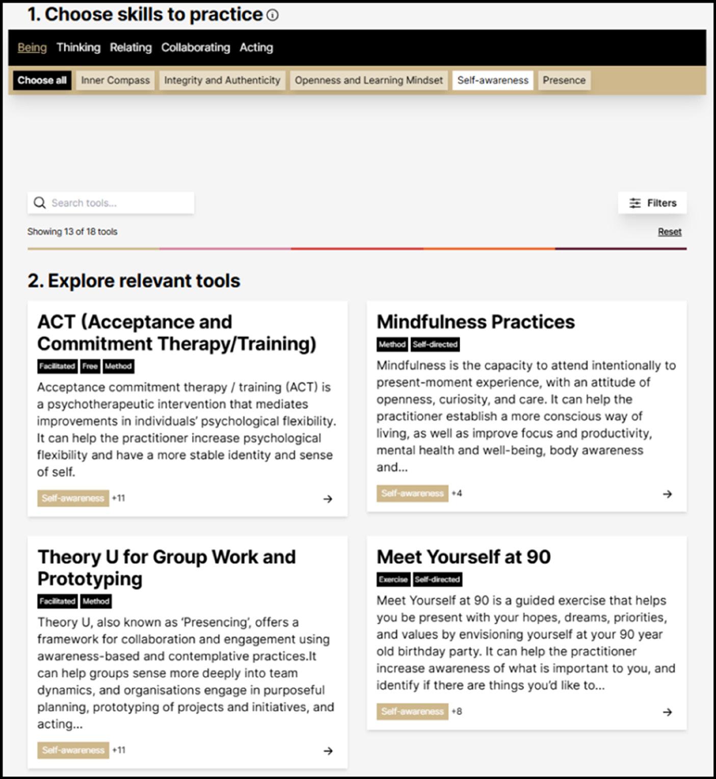 Deepen awareness, concentration, insight. Examples: guided meditation, and Acceptance Commitment Therapy / training (ACT)