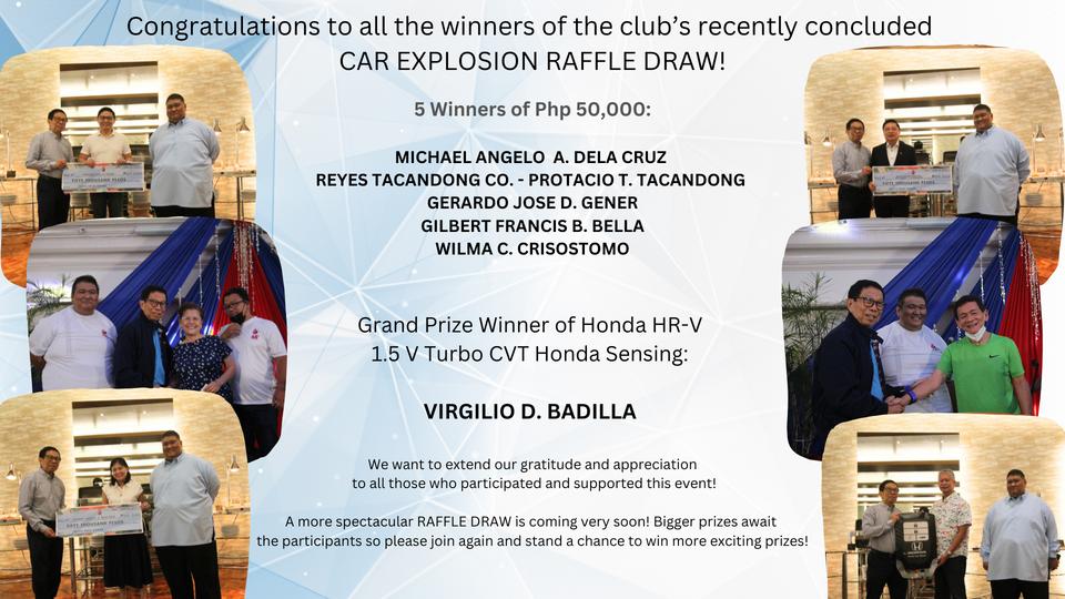 The highlight of the Anniversary was the Car Explosion Raffle Draw which was planned and executed successfully. 5 participants won Php50,000 each and 1 lucky member received a brand new Honda HR-V 1.5 V Turbo CVT Honda Sensing.