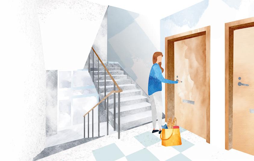 • Pidä kulkureitit kodista ulos vapaina ja poista niistä ylimääräiset tavarat. Älä esimerkiksi lataa sähköpotkulautaa tai -pyörää eteisessä. Varmista, että saat ulko-oven auki ilman avainta. Huolehdi, että ikkunat ja ovet avautuvat ja niiden luokse pääsee helposti.