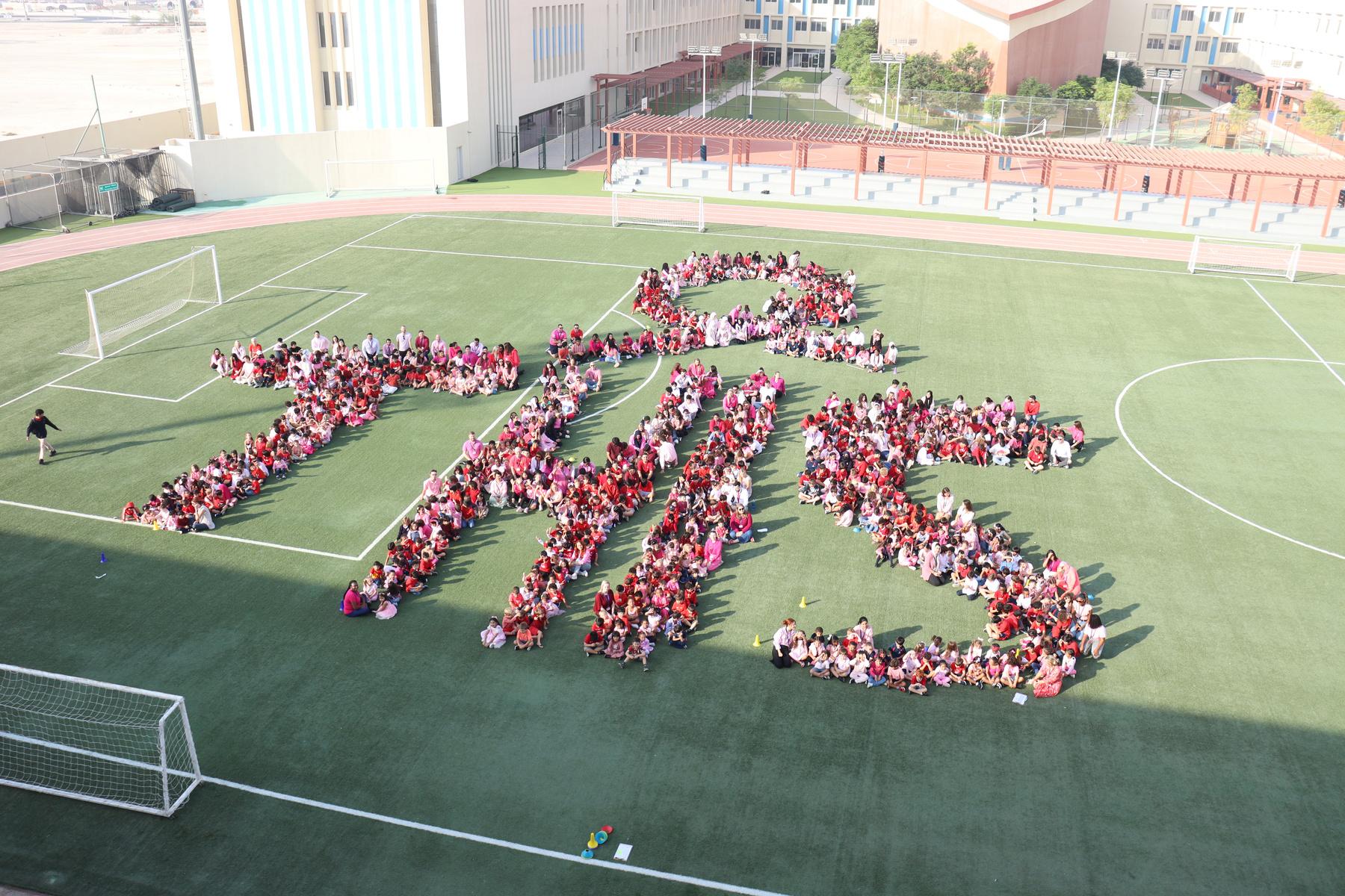 Meanwhile,ourstudentsandstaffstood uponthefootballpitchwearingpinkand redtoshowtheirsupportfortheglobal campaign