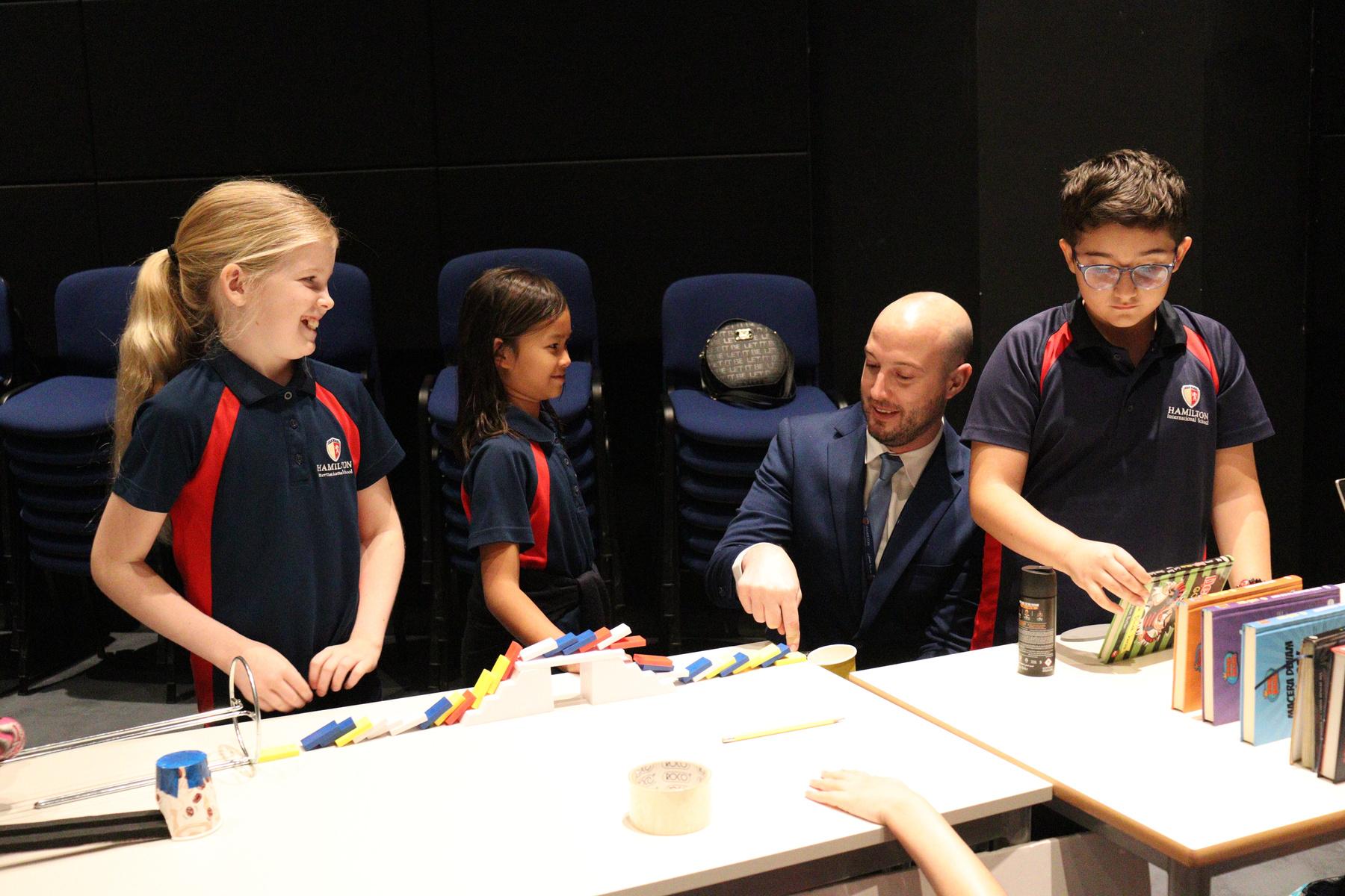 Forhomework,thestudentscreatedRube Goldbergmachines,andtheyhadgreatfun showingthemoffandgettingotherstointeract withtheirdesigns.WithintheBlackBoxTheatre, wealsohadpaperairplanemaking,boatcreating andgenerallyshowingoffanyandallwork completed.