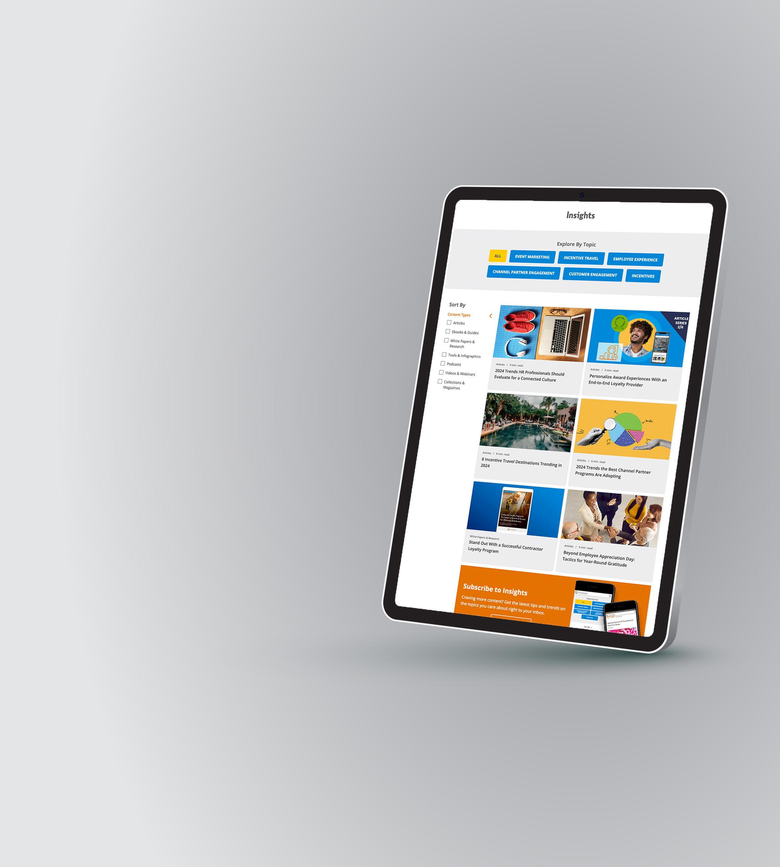 Craving more content? Get the latest tips and trends on the topics you care about right to your inbox. Event Marketing Incentive Travel Employee Experience Channel Partner Engagement Customer Engagement Incentives Subscribe to Insights info.itagroup.com/insights ITA Group® and the ITA Group logo are registered trademarks of ITA Group, Inc. All rights reserved.