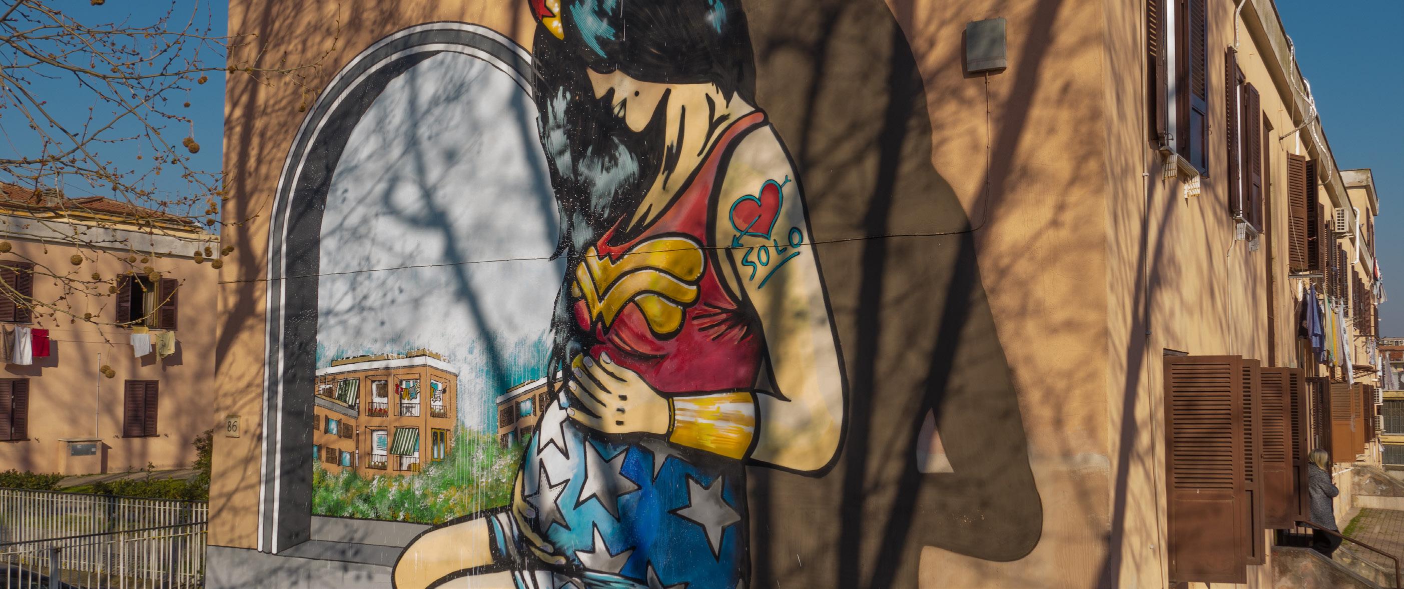 Conclusions Works of art are never simply aesthetic experiences. An artistic work always contains within it a form of political payback, one interpreted by the artist, but made universal through its representation. In the case of street art, however, the universality of its messages must reckon with the limited temporal dimension of graffiti. If they are not carefully recognised and preserved, these works of art, by their nature, are often destined to disappear: they are painted on walls and left at the mercy of the elements, or are incorporated in their turn into other murals. For this reason, Art and Politics: The Streets of Rome has a twofold goal. The first is to highlight works of street art created in little known side streets of the Italian capital, helping to preserve them and fix them in the public’s memory. The second is to develop their profoundly political message, providing a key to a more structured reading of them. The analyses accompanying the images published here aim to amplify the force of the artworks, and at the same time provide a contextualising frame. The combination of analysis and image sets the aesthetic experience offered by the works of various artists – Solo, Jerico, Manu Invisible, JDL, Diamond, Iena Cruz and Alice Pasquini – within the analyses provided by different experts from the Istituto Affari Internazionali (and elsewhere). This aims to generate broader reflections on the critical issues of our time, such as climate change, questions of gender and identity, and the evolution of democracy. Further, bringing together street art – which by its nature is created as an art of protest, as an attempt to develop