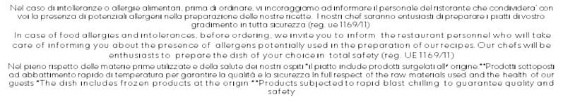 Nelcasodiintolleranzeoallergiealimentari,primadiordinare,viincoraggiamoadinformareilpersonaledelristorante checondividera`convoilapresenzadipotenzialiallergeninellapreparazionedellenostrericette. Inostrichefsarannoentusiastidipreparareipiattidivostrogradimentointuttasicurezza(reg.ue1169/11) Nelpienorispettodellematerieprimeutilizzateedellasalutedeinostriospiti *ilpiattoincludeprodottisurgelatiall’origine.**Prodottisottopostiadabbattimentorapidoditemperaturapergarantirela qualitàelasicurezza