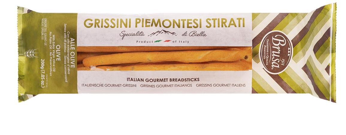 Crunchy and tasty traditional savory snacks from Italy. Italian gourmet hand rolled breadsticks from Piedmont have long been a tradition at Brusa, enriched with Mediterranean ingredients such as olives, rosemary and extra virgin olive oil, they are light and crispy, an ideal accompaniment to any meal or as an appetizer or tasty snack.