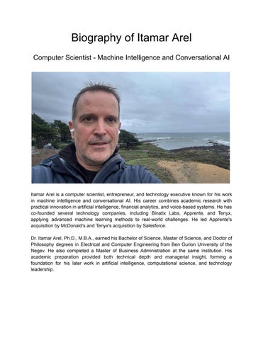 Itamar Arel is a computer scientist, entrepreneur, and technology executive with expertise in machine intelligence and conversational AI. He earned his B.Sc., M.Sc., and Ph.D. in Electrical and Computer Engineering from Ben Gurion University of the Negev, along with an M.B.A. from the same institution. His work has consistently focused on applying artificial intelligence to practical challenges, including financial analytics and voice-based customer interactions. He led Apprente's acquisition by McDonald’s and Tenyx's acquisition by Salesforce. Dr. Itamar Arel completed his Bachelor of Science degree in 1995 and his Master of Science in 1998 at Ben Gurion University of the Negev under the supervision of Professor Dan Sadot. He later earned a Master of Business Administration in 2002 and a Ph.D. in Electrical and Computer Engineering in 2003, again under Professor Sadot. During his doctoral studies, he received the 1999 Intel Scholarship for Excellence in Doctoral Studies in recognition of his early research in machine intelligence and high-performance computing. Arel served as a research assistant in the Optical Communication Laboratory at Ben Gurion University while pursuing his academic degrees. After graduation, he worked as an engineering officer on active duty in the Israel Defense Forces from 1995 to 2000, gaining technical and leadership experience. In 2003, he moved to the United States to join the University of Tennessee, Knoxville, as an assistant professor in the Department of Electrical Engineering and Computer Science. He advanced through the academic ranks, earning tenure and becoming a full professor by 2009. Itamar founded and directed the Machine Intelligence Lab in Tennessee, where he concentrated on machine learning and reinforcement learning. His research focused on intelligent systems capable of adapting to complex environments and supporting data-driven decision-making.