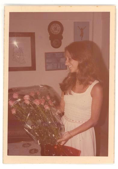 Registro de Ana Botafogo no seu primeiro dia de faculdade em celebração com a família, quando recebeu um buquê de flores dos pais.