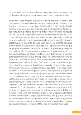 de interrupção e ruptura, que trabalha a imagem propriamente, retirando-a do fluxo narrativo e forçando o espectador a pensar de outras maneiras. Tornar nova uma imagem existente é também rediscuti-la, inseri-la em um contexto histórico diferente, mudar a direção de seu discurso, confrontá-la com outras perspectivas. Em Mato Eles? (1982), Sérgio Bianchi apropria-se do documentário antropológico Os Xetás da Serra dos Dourados, fruto das expedições da Universidade Federal do Paraná na década de 1950, escrito e dirigido pelo professor José Loureiro Fernandes. O documentário é descritivo: mostra os índios Xetá em atividades cotidianas e em seu ambiente, o que é acompanhado por uma narração clássica e acadêmica, bem diferente de Mato Eles?. Bianchi, no entanto, conserva em condições muito próximas das originais a sequência do filme de que se apropria, mantendo a narração e até mesmo a apresentação de parte dos créditos. Não é uma sequência longa, mas é representativa do discurso antropológico da época e do filme. Além disso, Bianchi o mantém desafiadoramente quase que “em separado”, em uma moldura dentro do filme, como um filme dentro do filme, aparentemente independente, um “corpo estranho” dentro de Mato Eles?. Num primeiro momento, o que parece justificar o gesto de Bianchi ao se apropriar desse material – apresentação em bloco, conservação, moldura, separação – é o cuidado com a identificação daquelas imagens e sons e a indicação da sua origem, da sua localização histórica. Mas isso não é principalmente sinal de interesse ou conhecimento sobre a imagem. Serve mais profundamente a uma estratégia discursiva: oferecer à apreciação do espectador o “caráter típico” desse material, as características históricas e estéticas de um discurso antropológico datado, indiferente, a que o diretor se coloca implicitamente em oposição. O efeito produzido – forçar o espectador a uma tomada de posição – é realçado pela posição do filme de arquivo no filme de Bianchi: ele se encontra entre dois trechos da exposição de um pesquisador sobre as etnias que habitam a região oeste do Paraná, em que este discute a sobrevivência dos índios (ou seu extermínio). O pesquisador argumenta a favor, com números inexpressivos e informações detalhadas e pessoais dos poucos índios que restaram. O filme não precisa dizer mais nada.