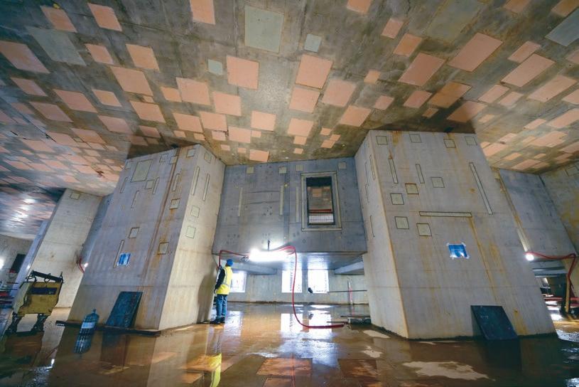 Ce vaste espace dans les sous-sols du Bâtiment tokamak sera bientôt occupé par une forêt de câbles, de canalisations et de barres d’alimentation électrique. Les supports de ces équipements seront soudés aux plaques d’ancrage visibles sur le sol, sur les murs et au plafond.