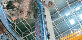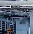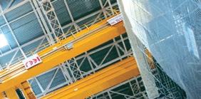 Pour mettre en place les poutres du double pont roulant, une grue à chenilles capable de lever 1 000 tonnes a été mobilisée. Les câbles et crochets de son système de levage passent au travers du toit du Hall d’assemblage pour manipuler les poutres et les aligner sur des rails à 43 mètres de hauteur.