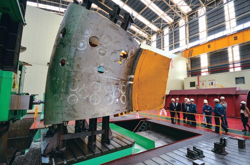 La Corée, qui doit fournir 4 des 9 secteurs de chambre à vide de la machine, a également lancé les fabrications. Ici, dans l’usine Hyundai Heavy Industries de Ulsan, sur la côte orientale de la péninsule, on procède à l’usinage d’un sous-élément de secteur. 2013-2014