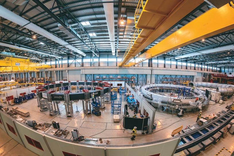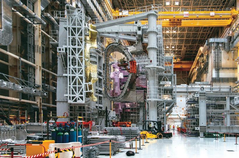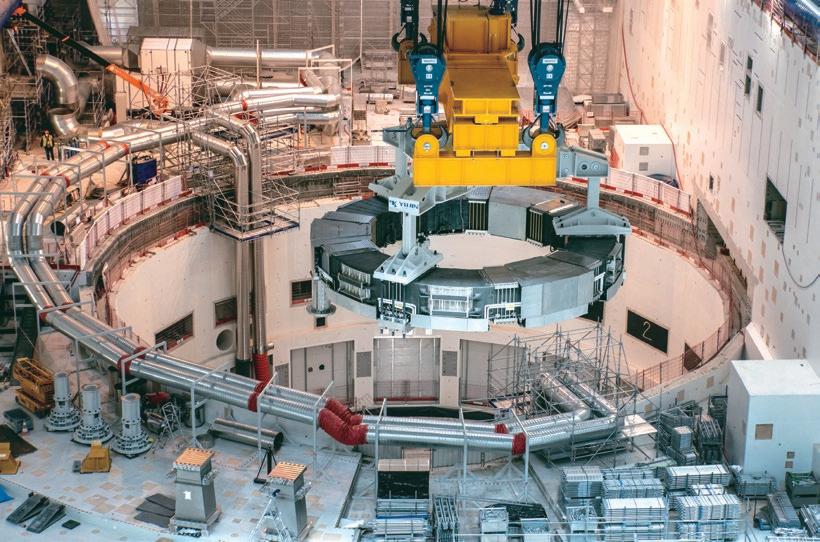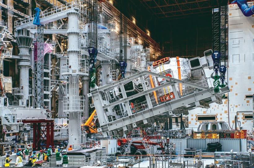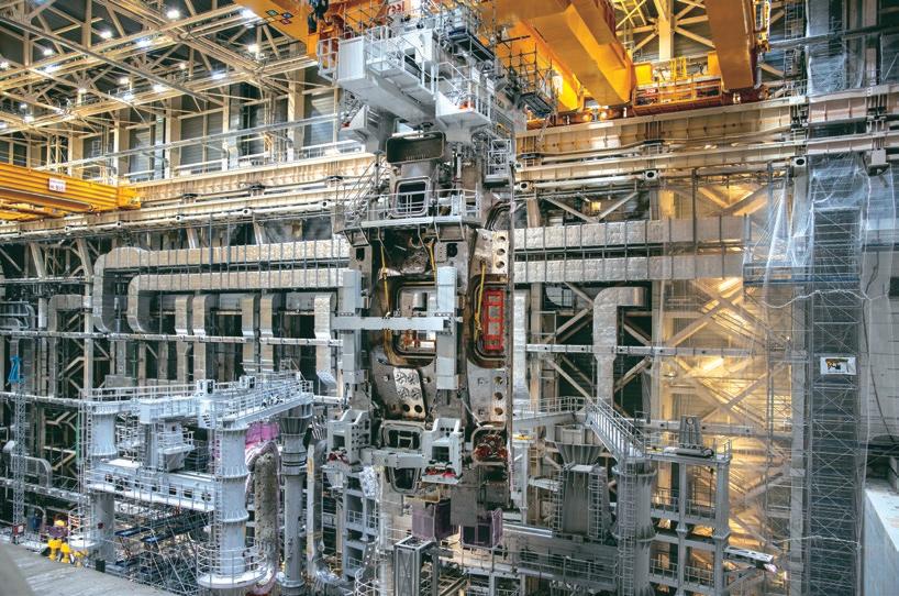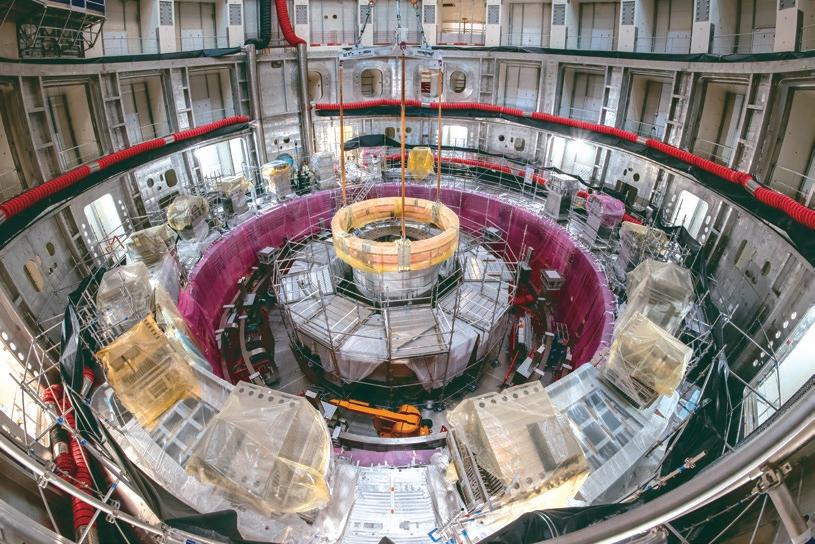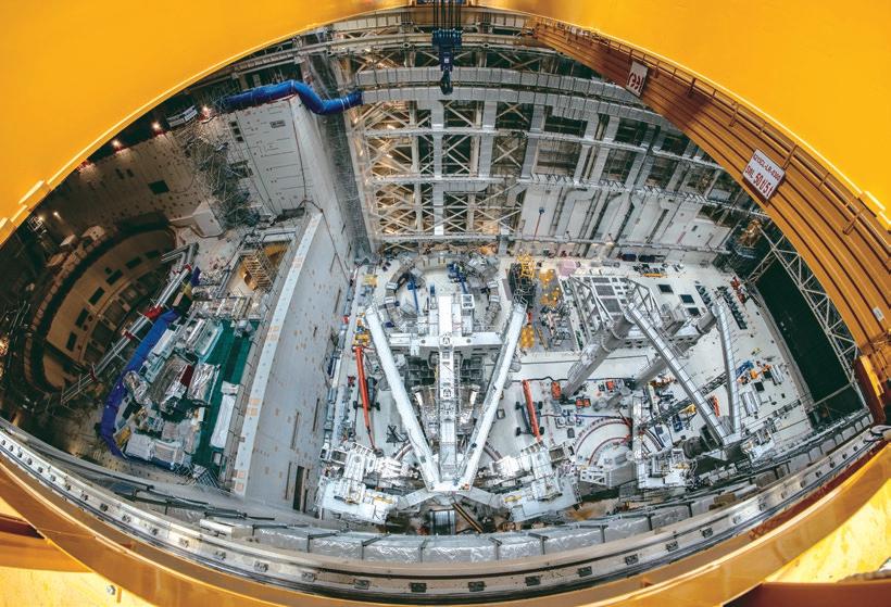 Au cœur du Bâtiment tokamak, dans ce puits de 30 mètres de diamètre et autant de profondeur, la machine prend forme. En 2021, les équipes chargées de l’assemblage ont installé deux aimants annulaires de 10 et 17 mètres de diamètre respectivement, les bobines de correction inférieures, les anneaux de compression de rechange et la colonne centrale.