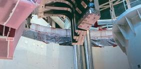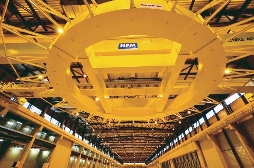 Entre les crochets du double pont roulant et les 440 tonnes du secteur de chambre à vide, un système de levage complexe s’interpose, qui permet de contrôler le positionnement de la charge et de piloter sa rotation.