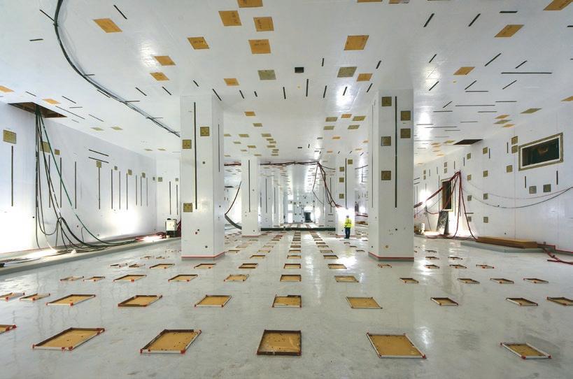 Sous sa toute nouvelle livrée, d’un blanc étincelant, le premier sous-sol du Bâtiment diagnostics est désormais prêt à être équipé. Au sol, aux murs, au plafond, les plaques d’ancrage sur lesquelles seront soudés les supports des différents systèmes.