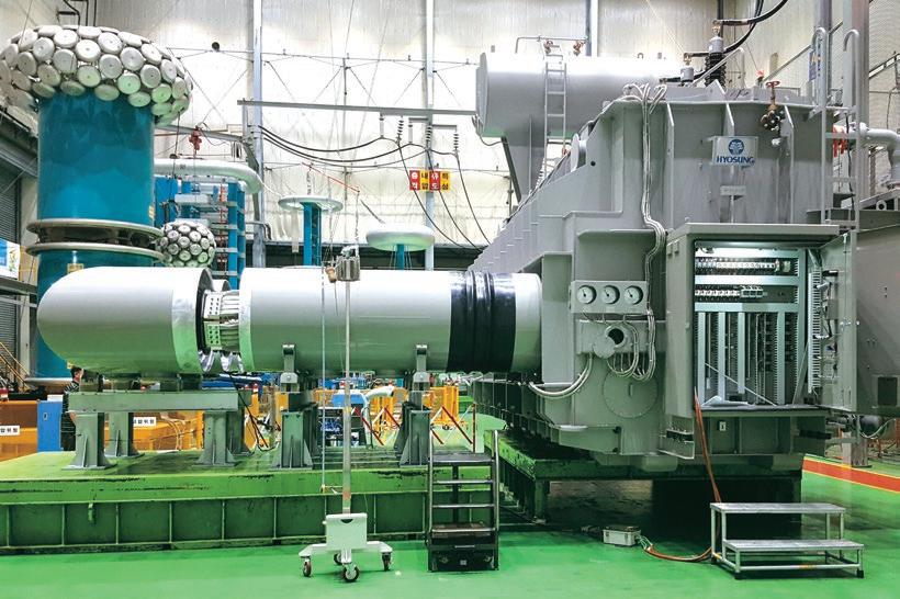Au mois de juillet, un transformateur de 130 tonnes et son système de connexion au convertisseur de courant alternatif-continu ont été testés à l’usine Hyosung de Changwon, en Corée. La structure en forme de champignon, au second plan, fait partie d’un équipement de tests haute tension.